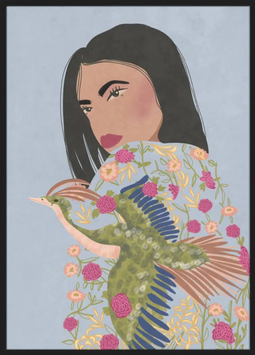 Farverig illustration af kvinde med trane. Et poetisk og drømmende motiv med japansk inspiration.