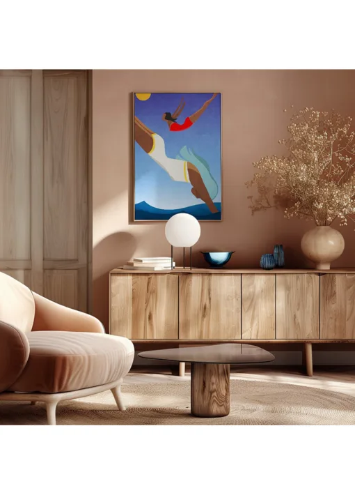 Graceful Dive af Emel Tunaboylu er et kraftfuldt og poetisk motiv fyldt med bevægelse. De to dykkere er skabt i rene, flade farver, hvor den klare blå himmel, den mørke havoverflade og de varme hudtoner giver en stærk kontrast. Den gule sol og den røde badedragt tilføjer varme og fokus. Emel Tunaboylu arbejder med en enkel, grafisk formsprog, der alligevel føles levende og kropsligt. Motivet passer perfekt i stue, sommerhus, badeværelse eller et aktivt rum, hvor farver og energi gerne må fylde og skabe strandstemning hele året.