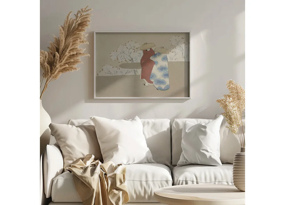 I Hanami Season from Momoyogusa skildrer Kamisaka Sekka en traditionel scene fra forårets hanami – den japanske fejring af kirsebærblomsterne. De lyse pastelfarver og rolige linjer fremhæver en følelse af fred og harmoni. Kvindernes elegante kimonoer i røde og blå toner står i kontrast til de hvide blomster, hvilket giver et afbalanceret og harmonisk udtryk. Perfekt til soveværelse, stue eller et lyst rum med rolig atmosfære.