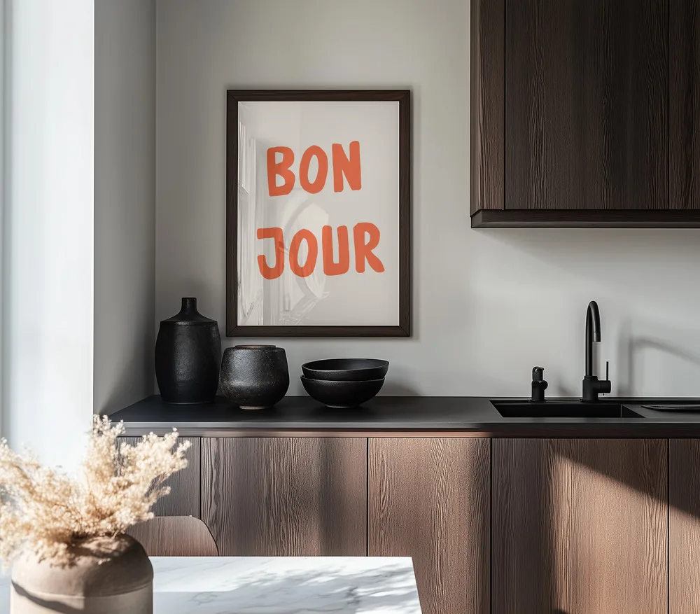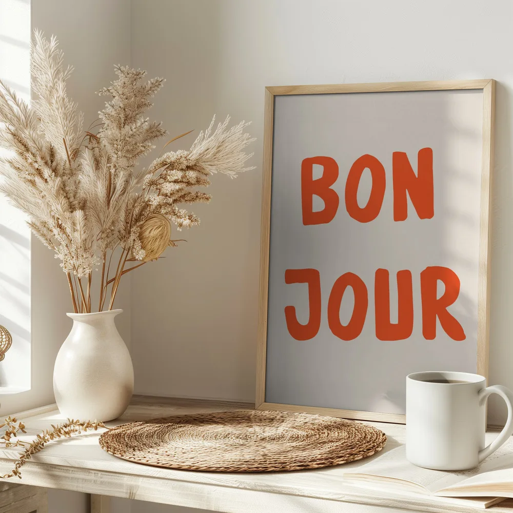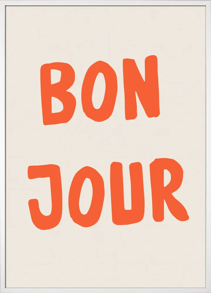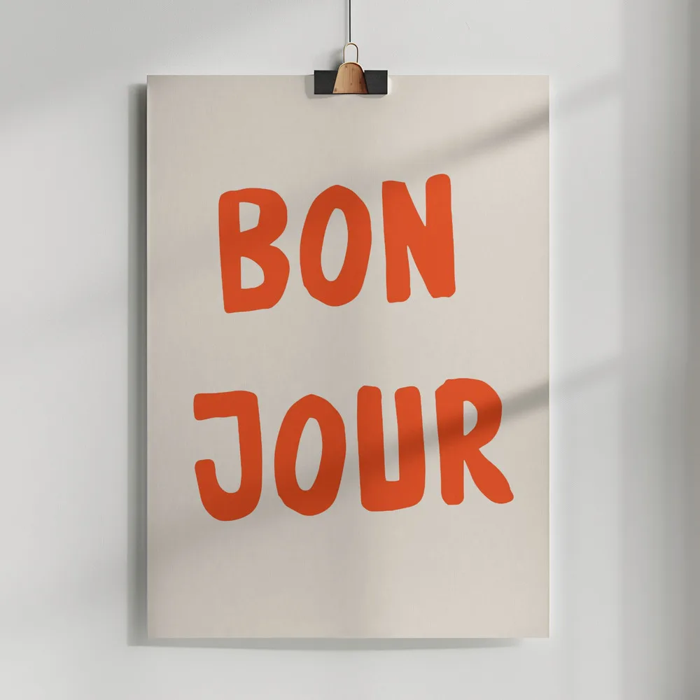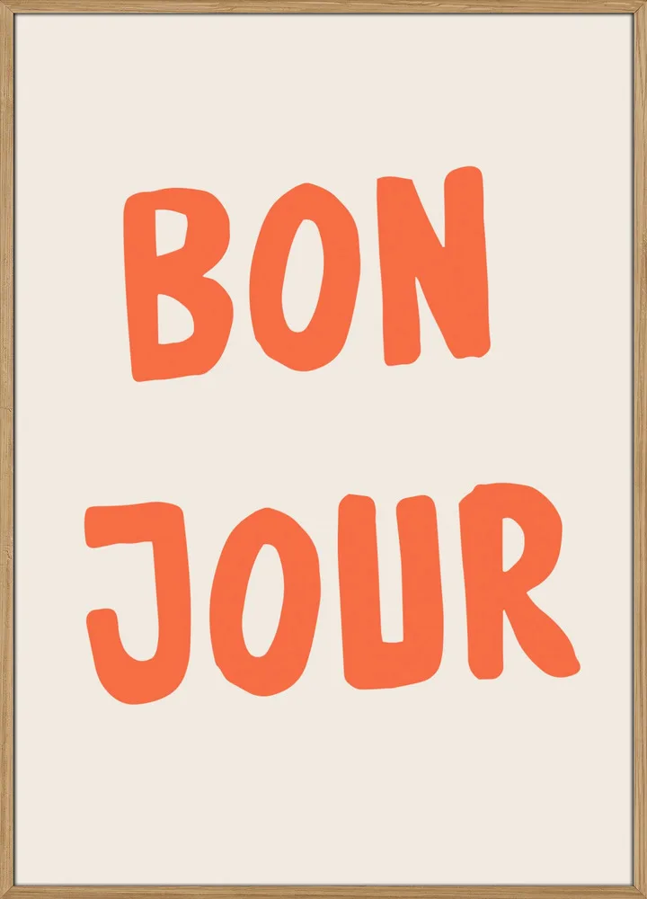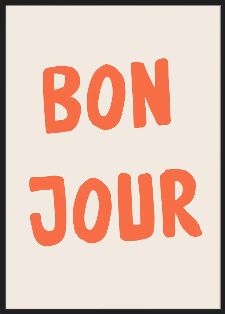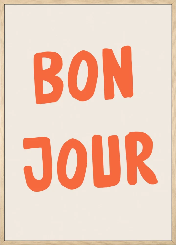 Legende plakat med teksten Bonjour i håndmalet orange på beige baggrund. En varm og venlig hilsen i fransk stil.