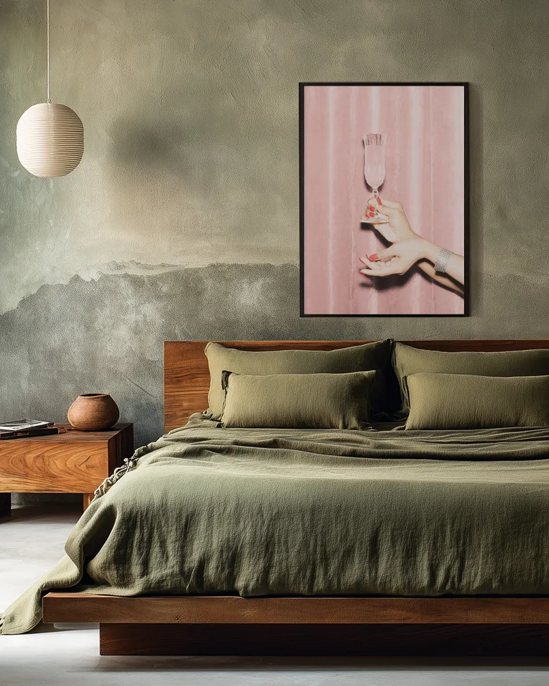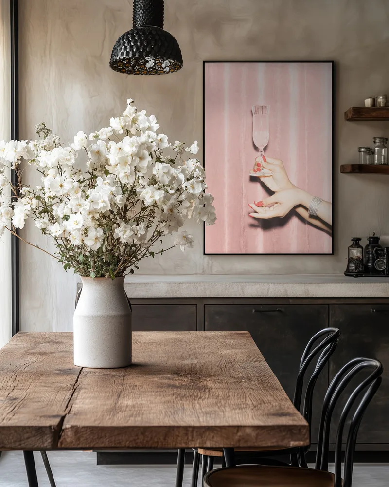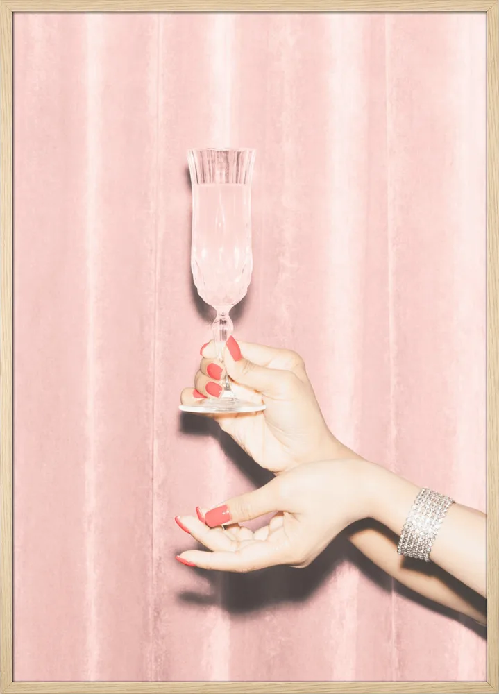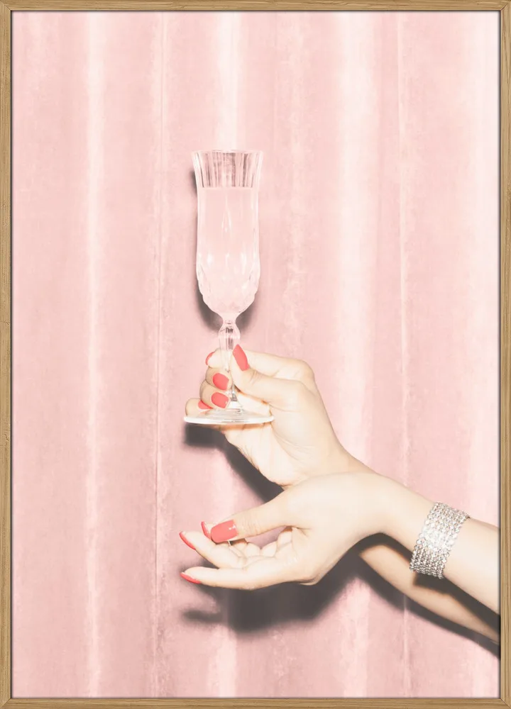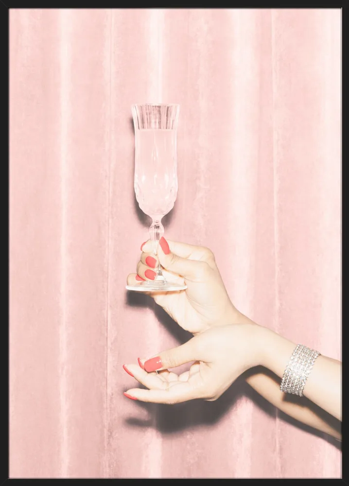 Plakat med et glamourøst motiv af en hånd, der løfter et glas mod en rosa baggrund. Elegant og sofistikeret med et moderne twist.