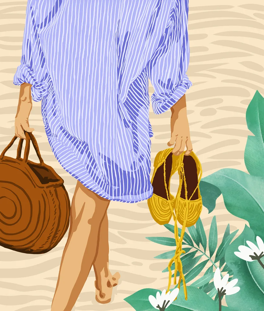Sommerlig illustration af Uma Gokhale med kvinde på stranden. Et varmt og afslappet motiv med bløde nuancer og feriefornemmelse.