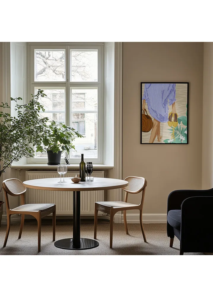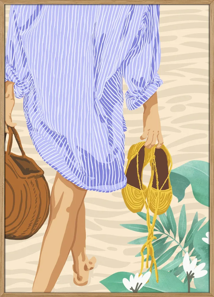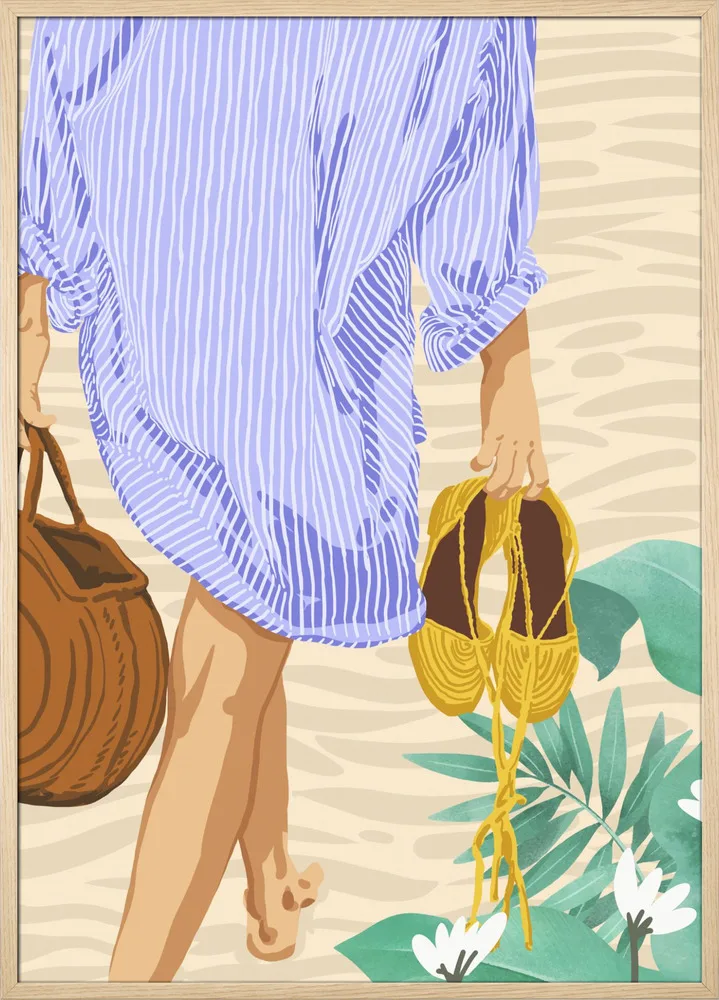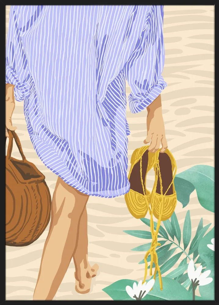 Uma Gokhale fanger essensen af ro og frihed i I Followed My Heart and It Led Me to the Beach. En kvinde i stribet skjorte og stråtaske går barfodet i sandet mod havet, omgivet af grønne planter og sollys. De beige, blå og grønne toner skaber en varm, naturlig stemning, der leder tankerne hen på ferie, frihed og havluft. Plakaten passer perfekt til badeværelse, sommerhus eller soveværelse og tilfører rummet et strejf af sol og ro.