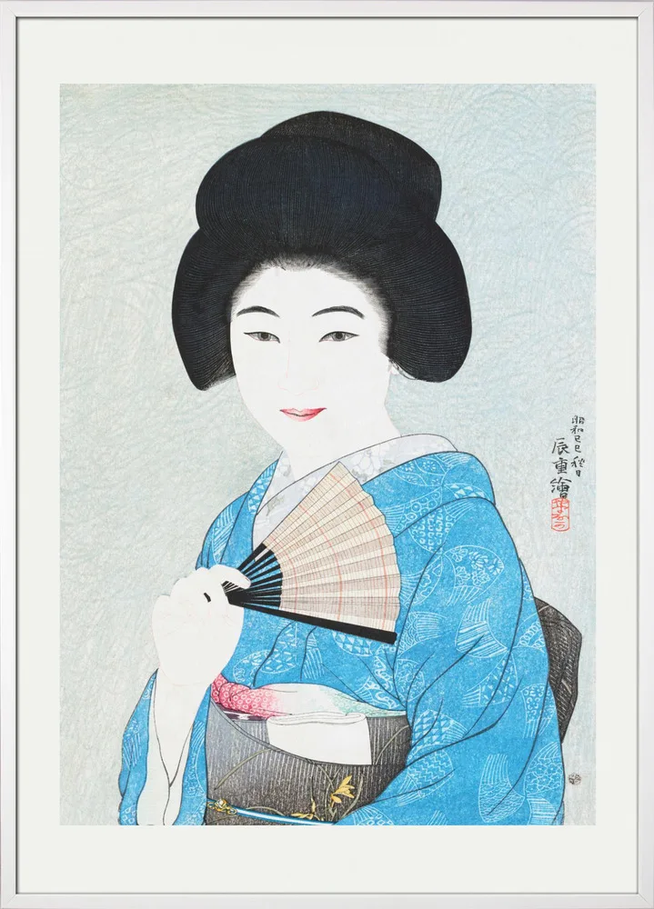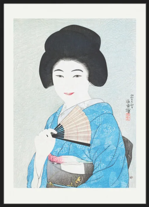 Japanese Woman (1929) af Yamanaka Kodo er et tidløst portræt af en kvinde i blå kimono, der holder en vifte. Detaljerne i tekstilerne og hendes milde udtryk formidler både ynde og værdighed. Værket afspejler den japanske shin-hanga-stil, hvor tradition og modernitet mødes. Plakaten passer perfekt i soveværelset, stuen eller et roligt hjørne, hvor den tilfører balance og varme.