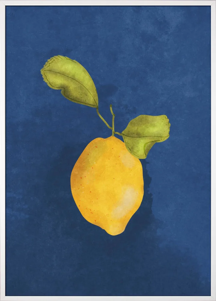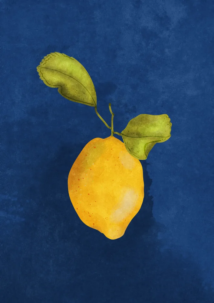 Just a Little Lemon af Raissa Oltmanns fanger essensen af enkelthed og farvespil. Den gule citron står skarpt mod den mørkeblå baggrund og skaber en smuk kontrast. Et motiv, der passer perfekt til køkkenet, spisestuen eller som frisk farvepift på billedvæggen. En moderne klassiker i sin enkelhed.
