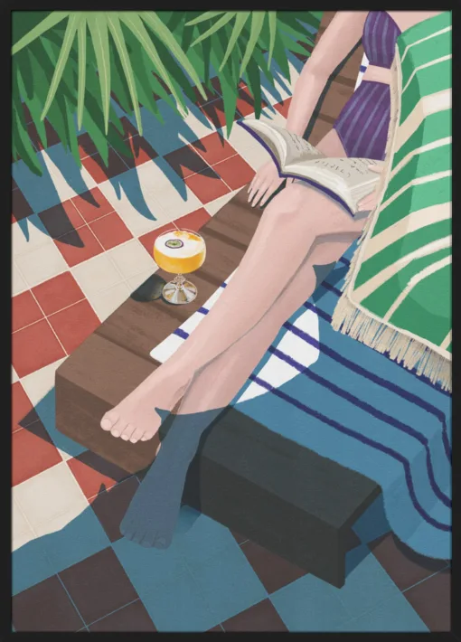 Just one more chapter af Goed Blauw er en stemningsfuld illustration, der indfanger et stille sommerøjeblik ved poolkanten. De grønne striber på solsengen, de brændte terracottafliser og det klare blå vand skaber en levende farvepalet, der både er moderne og nostalgisk. Personen, der læser, formidler en følelse af ro og nærvær, mens de små detaljer – sandaler, koppen og skyggerne fra solen – tilføjer realisme og varme. Stilarten er illustrativ, legende og rig på tekstur. Motivet passer især godt i sommerhuset, stuen eller et lyst hjørne, hvor det kan tilføre en følelse af afslapning og ferie. Det fungerer både som solomotiv eller som del af en farverig væg med andre natur- og sommerinspirerede prints.