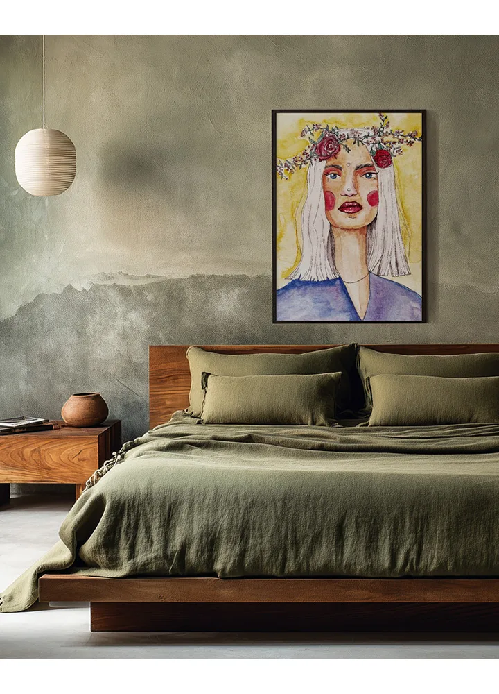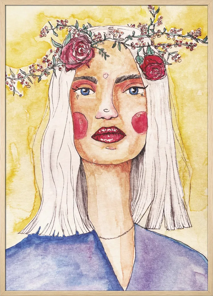 Portræt af kvinde med blomsterkrans i håret. Et drømmende og kunstnerisk motiv.