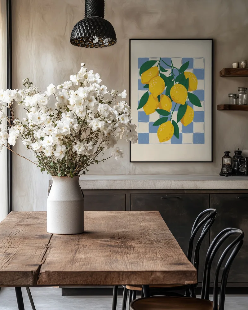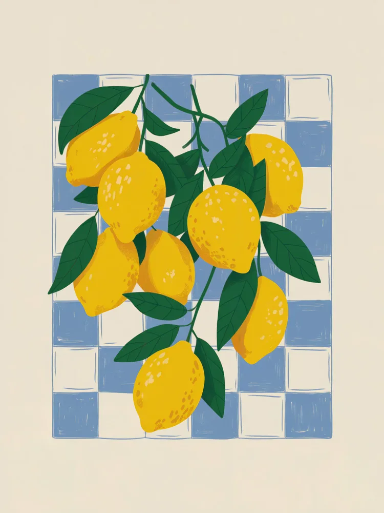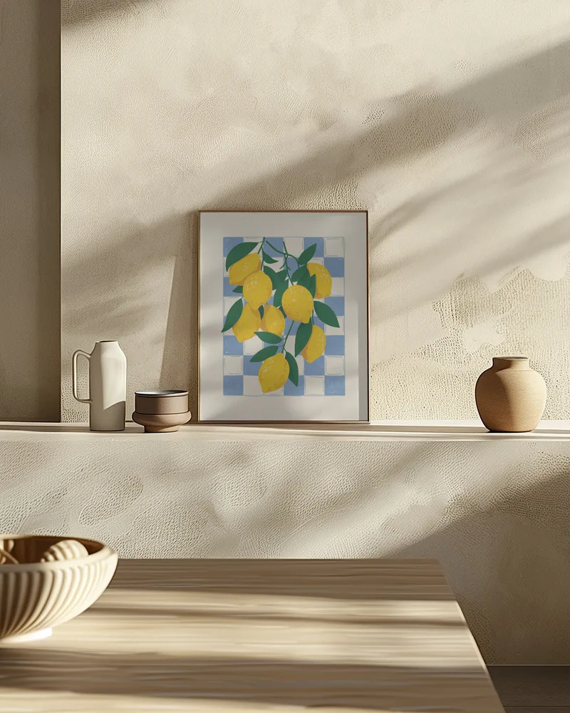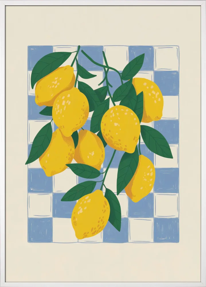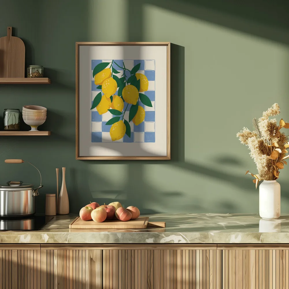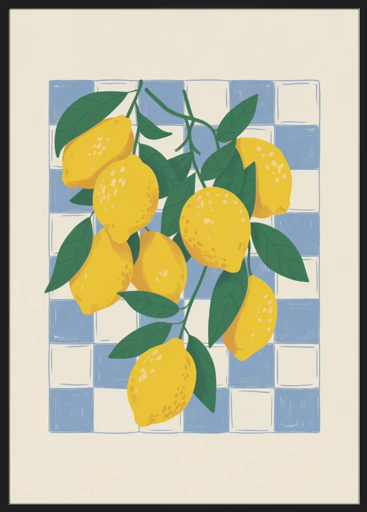 Et friskt citrusmotiv med grafisk mønster. En livlig plakat, der giver energi og farve i køkkenet.