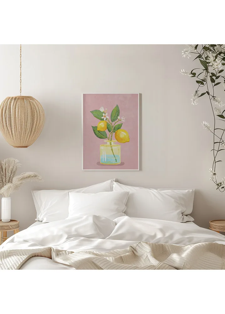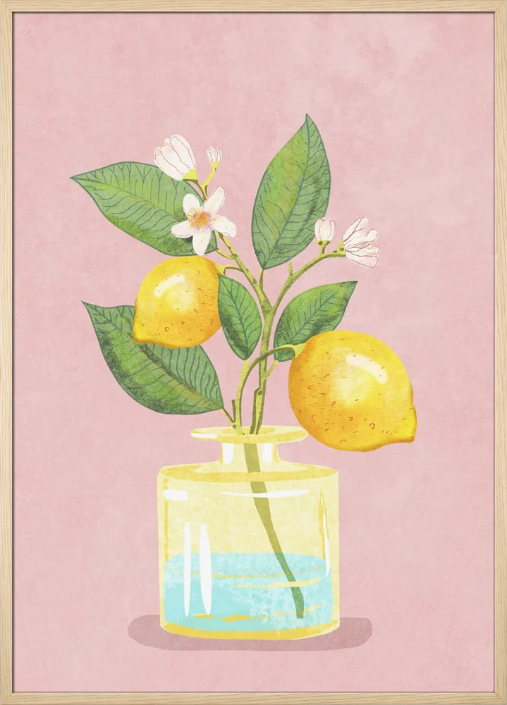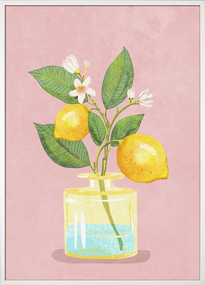 Raissa Oltmanns’ Lemon Bunch in Vase bringer friskhed og lethed ind i hjemmet. De gule citroner og grønne blade står smukt mod den lyserøde baggrund og skaber et opløftende og harmonisk udtryk. En plakat, der passer perfekt i køkkenet eller spisestuen og spreder solrig energi.