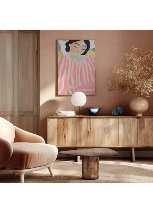 Lemon Daydream af Treechild er et varmt og sanseligt motiv, hvor en kvinde sidder i rosa striber omgivet af citroner og grønne blade. De bløde penselstrøg og den pastelfarvede palet giver værket en rolig, dagdrømmende stemning. Stilen kombinerer femininitet, natur og kunstnerisk blidhed. Ideelt til soveværelse, køkken, stue eller hyggekrog, hvor man ønsker en varm og poetisk atmosfære.