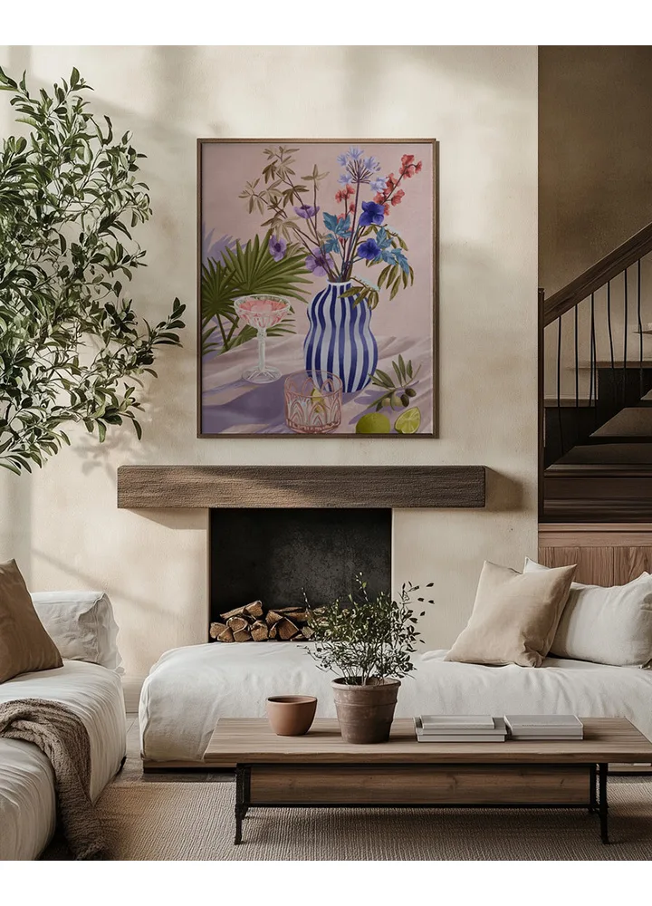 Lilac Summer af Goed Blauw kombinerer dekorative blomster og drømmende farver i en harmonisk komposition. Den blåstribede vase står i midten omgivet af sarte lilla, blå og rosa blomster, mens grønne blade skaber balance i farvepaletten. Baggrunden er blød og let med varme beige toner, der giver motivet et klassisk, men moderne udtryk. Stilarten er illustrativ med fokus på farveflader, tekstur og botaniske detaljer. Motivet er oplagt til stuen, soveværelset eller spisestuen og passer også godt sammen med andre florale prints i en billedvæg.