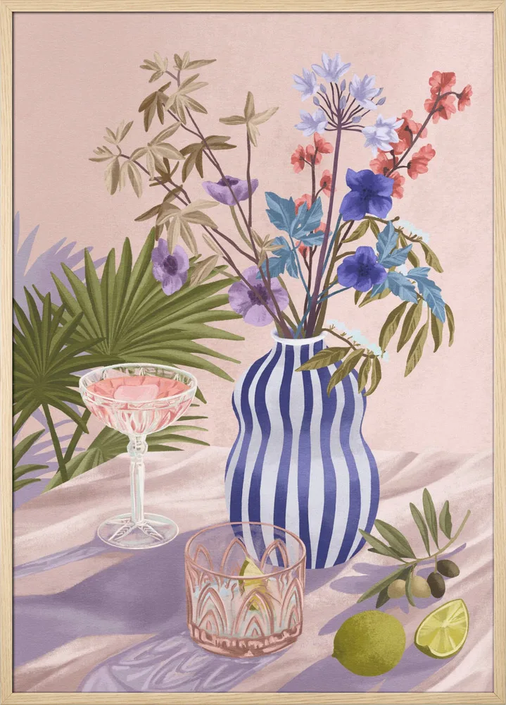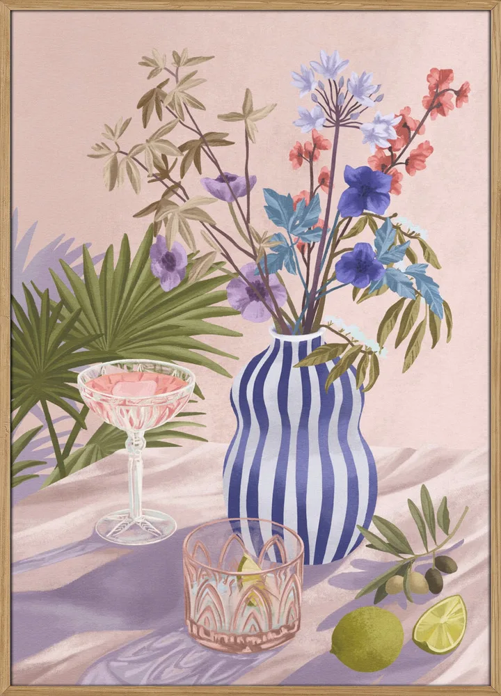 En elegant og romantisk illustration med en blåstribet vase, sommerblomster og sarte farver. Motivet udstråler ro, lethed og klassisk skønhed med et moderne twist.