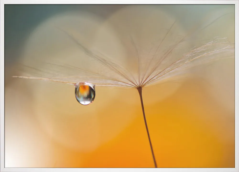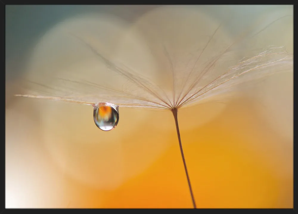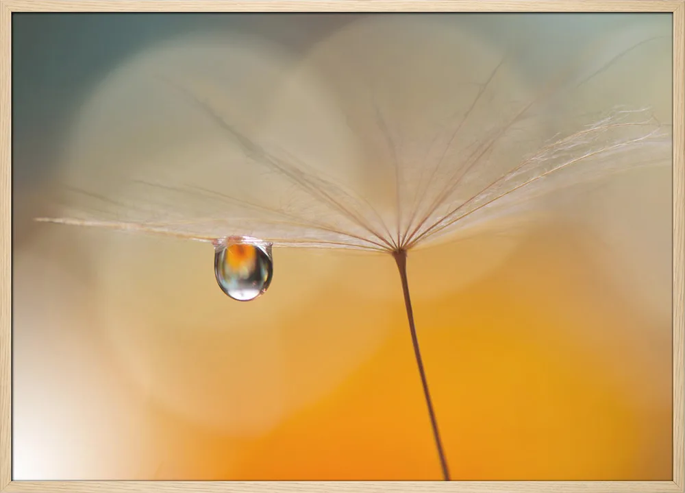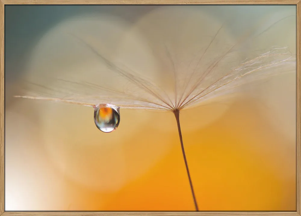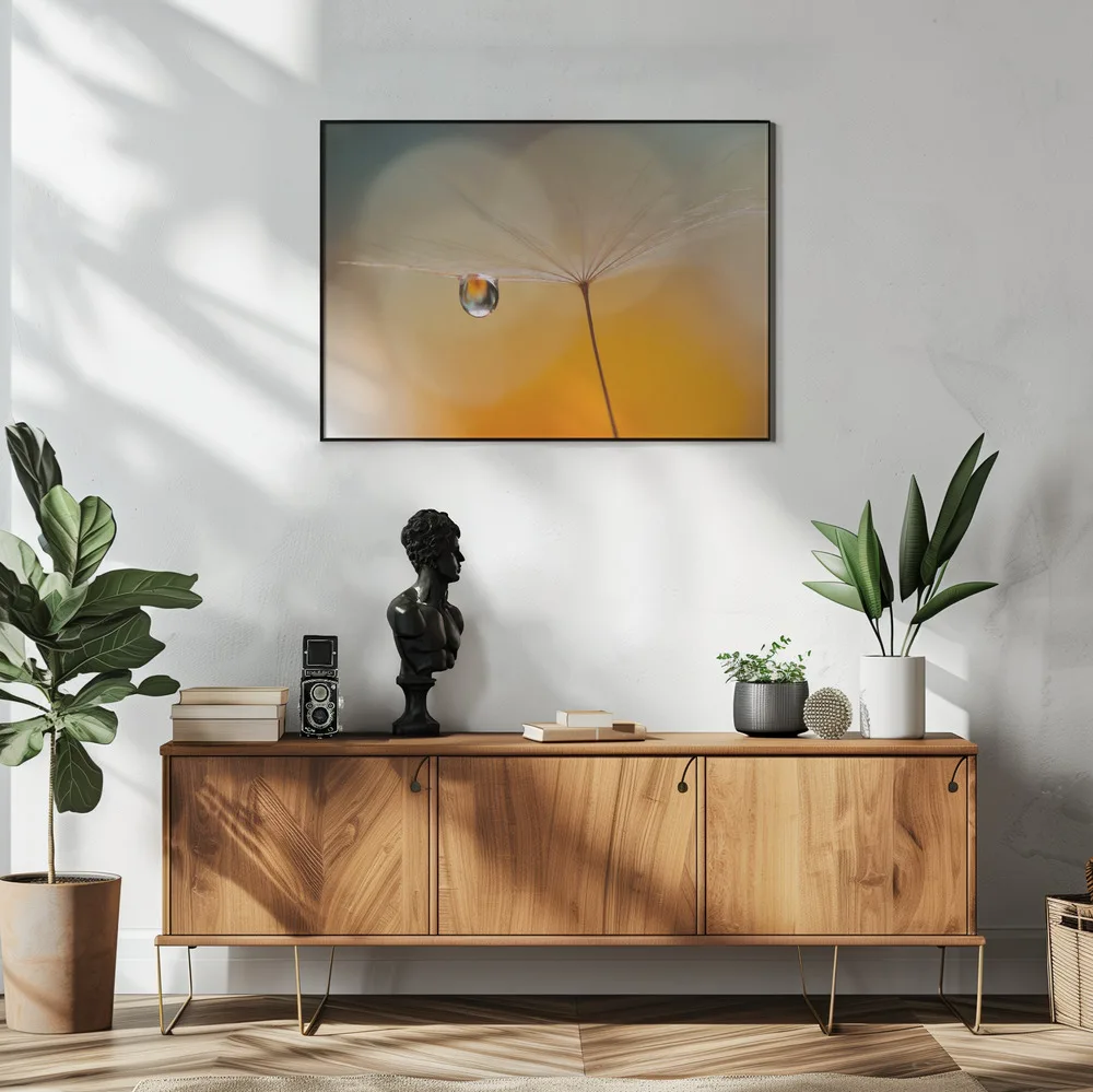 ‘Little Night Music’ af Juliana Nan er en stemningsfuld naturplakat, der fanger øjeblikkets skønhed i det helt små. En dråbe, der hænger i perfekt balance på et frø, reflekterer lyset som en lille verden i sig selv. De varme, gyldne farver og det bløde fokus skaber en drømmende ro, der passer smukt i soveværelse eller stue. Juliana Nans blik for detalje og lys gør plakaten til en poetisk hyldest til naturens enkelhed.