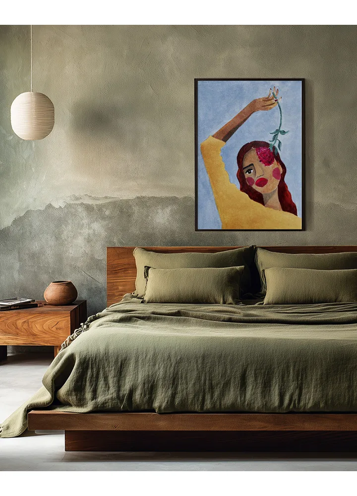 Raissa Oltmanns’ Magda with Flower kombinerer skønhed og sårbarhed. Kvinden med blomsten, der dækker øjet, fremstår både stærk og følsom. De blå, røde og gule nuancer skaber et levende, kunstnerisk udtryk. En plakat, der vækker følelser og giver karakter til ethvert rum.