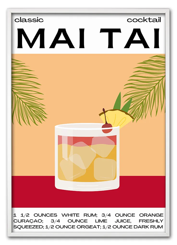 Tropisk plakat med Mai Tai og opskrift. Varme farver og palmeblade skaber feriestemning.