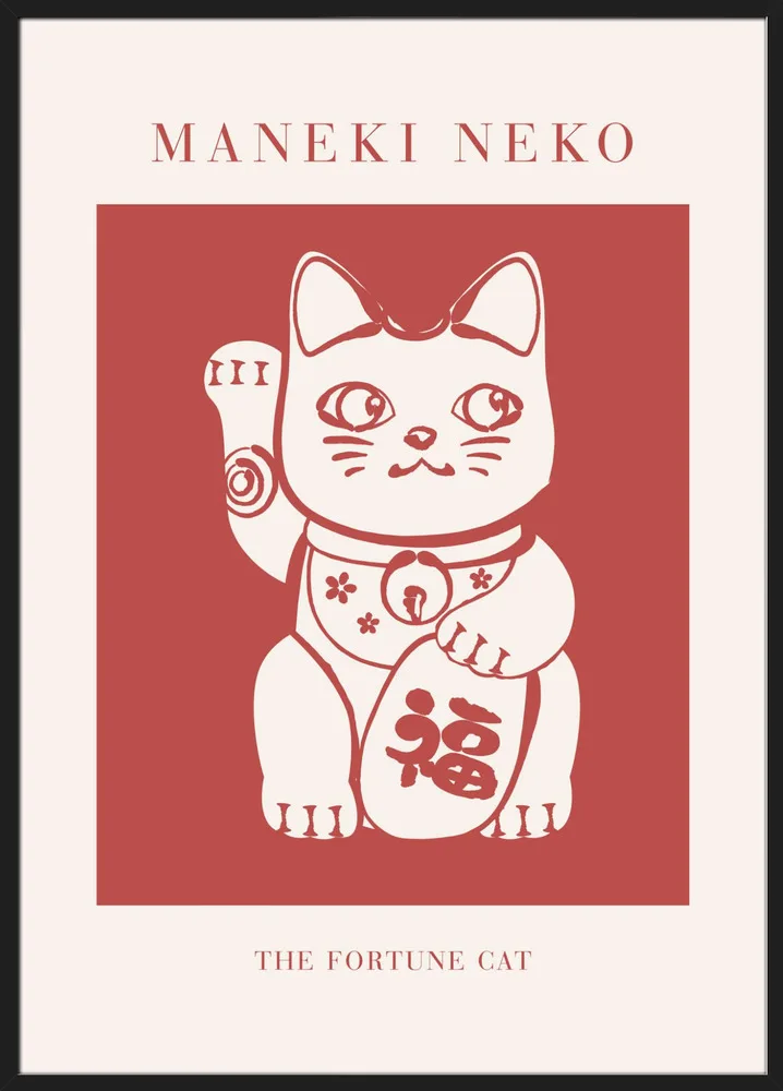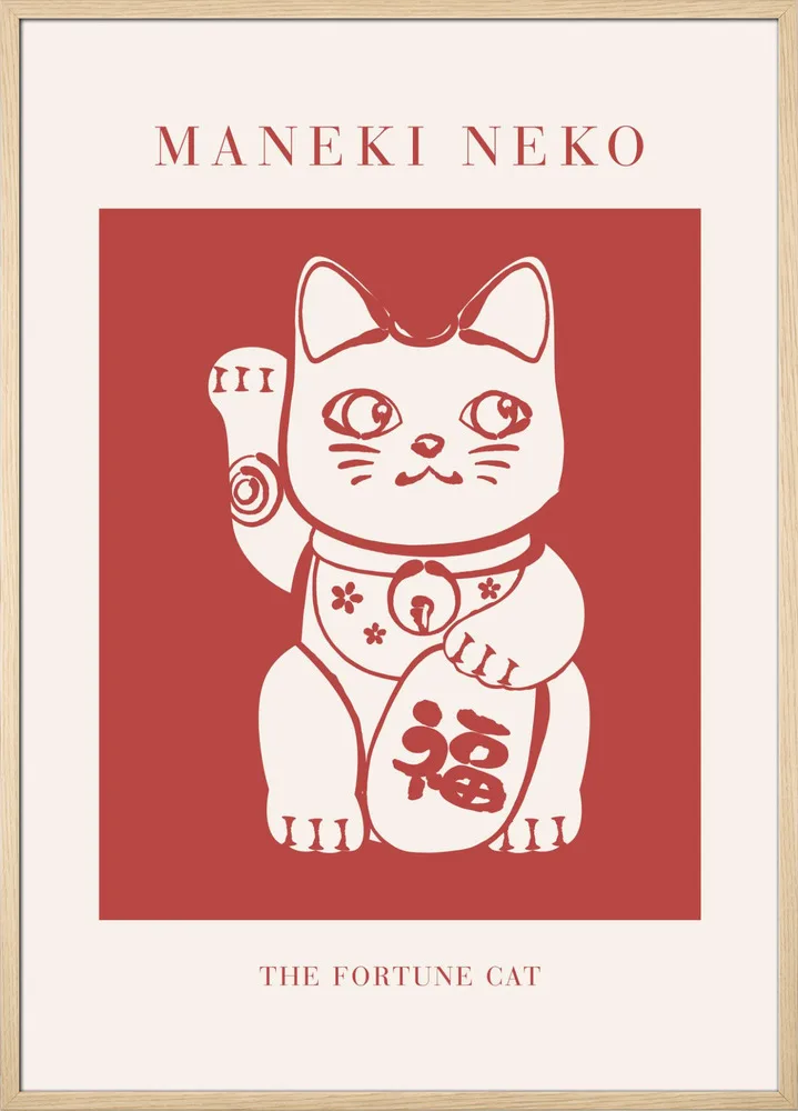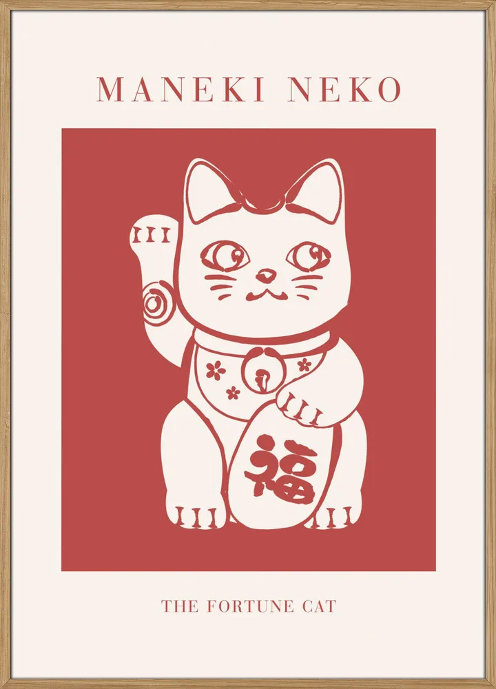 Japansk plakat af KsanaKalpa med rød lykkekat. Et stilrent og heldbringende motiv.