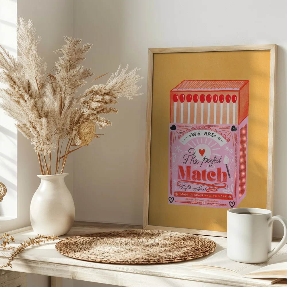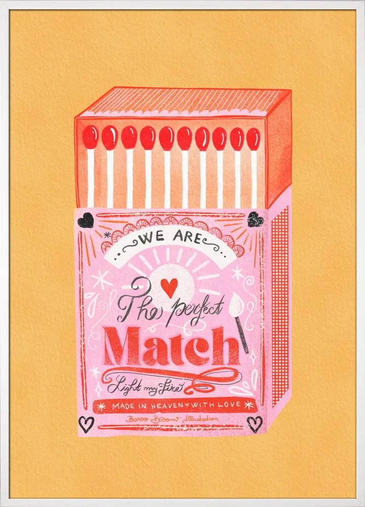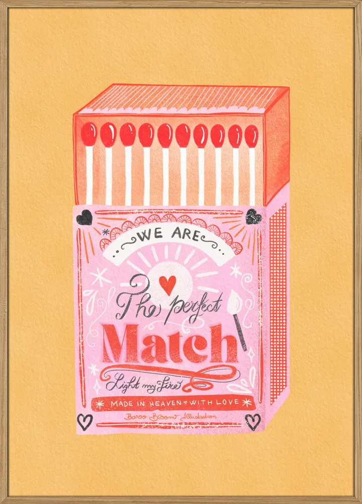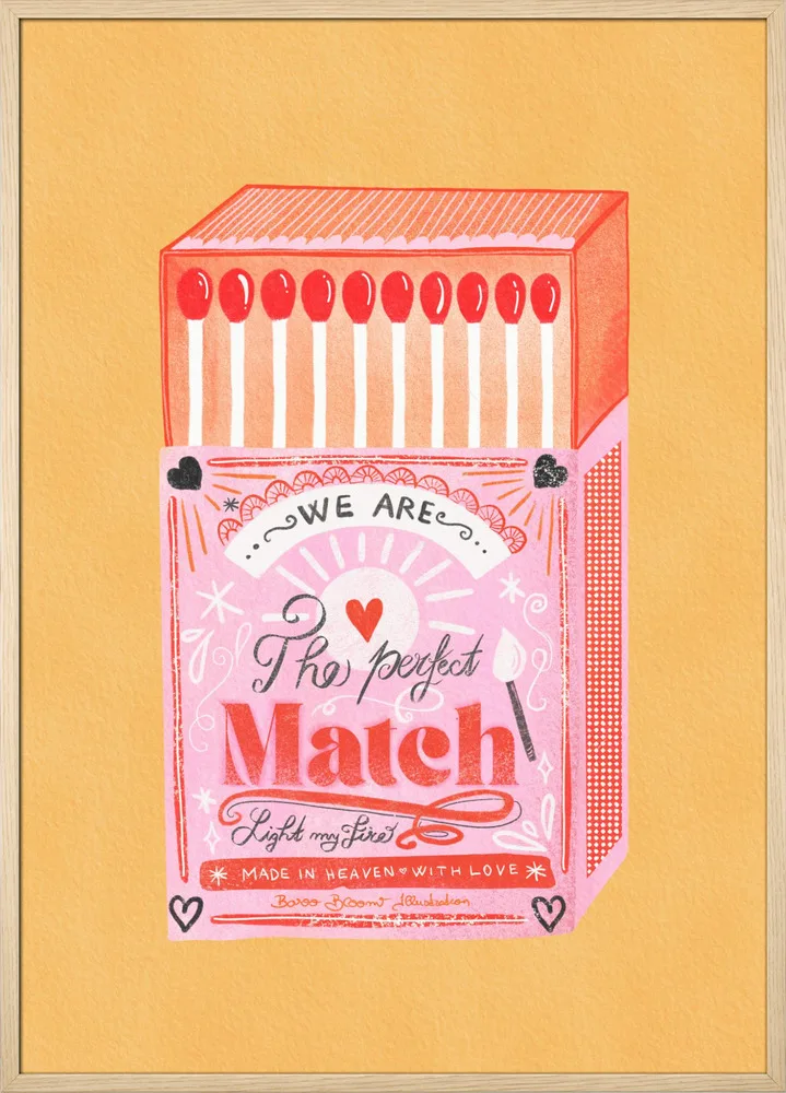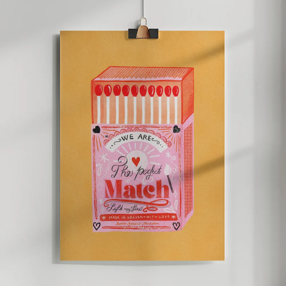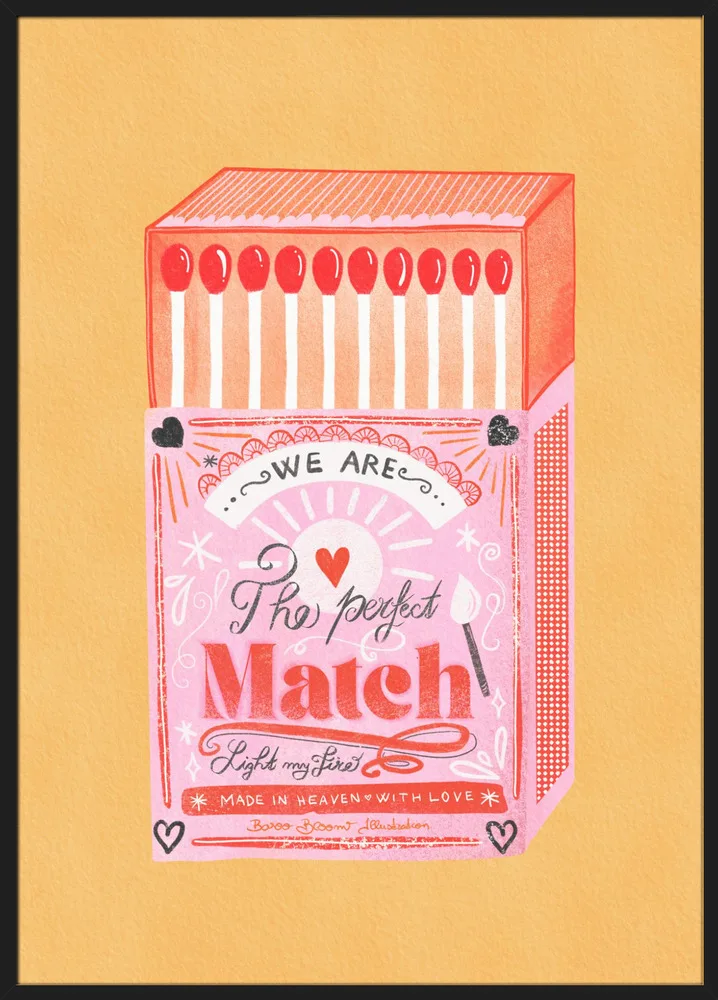 Farverig illustration af en tændstikæske i pink og rød med teksten The Perfect Match. En retroinspireret plakat fuld af charme.