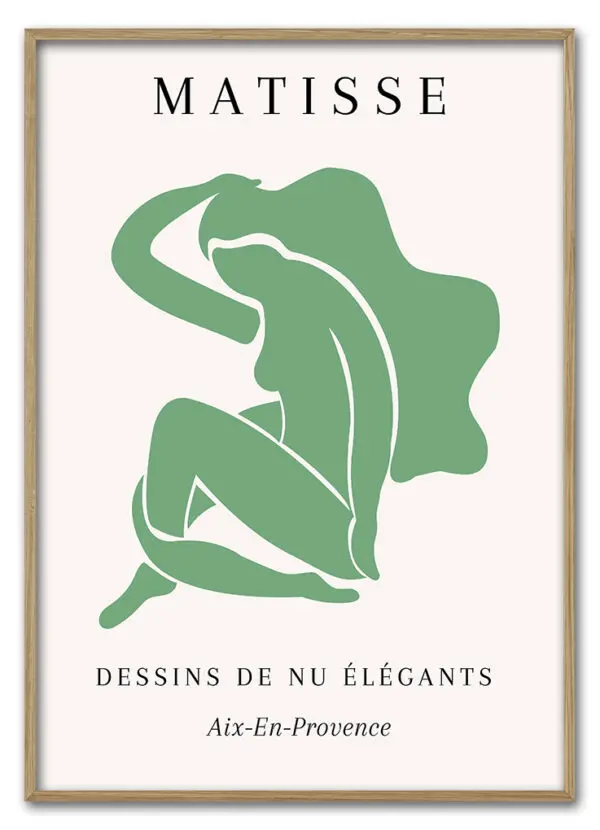 Matisse Elegant Nude No. 01 præsenterer en harmonisk kvindefigur i lys grøn silhuet. Figuren er i bevægelse, nærmest dansende, og udstråler elegance og frihed. Den lyse, varme baggrund giver en rolig kontrast til den friske grønne farve, og layoutet er enkelt med let typografi, der understøtter det kunstneriske udtryk. Plakaten passer perfekt i lyse og luftige rum, som stue, soveværelse eller kontor, og tilføjer en følelse af balance og skønhed. Elegant Nude-serien kan med fordel hænges som sæt, og denne plakat står flot sammen med Elegant Nude No. 02.