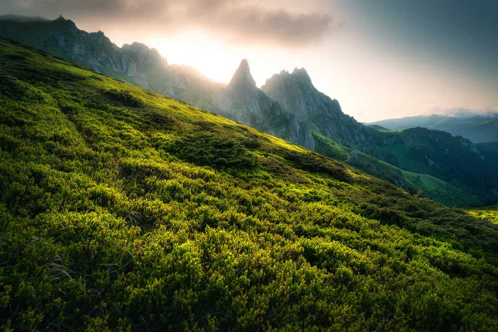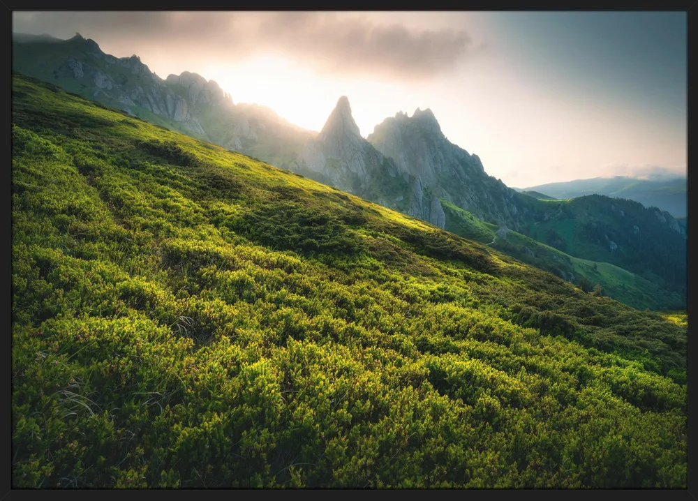 Naturplakat med sollys over grønne bjerge. Roligt, smukt og inspirerende motiv med fokus på naturens storhed.