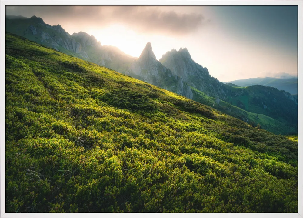 ‘Moments of (un)clarity’ af Ionut Petrea indfanger naturens storslåede ro i en smuk bjergscene. Sollyset, der rammer bjergtoppene, skaber en næsten spirituel stemning. Petreas arbejde forener teknik og følelse, og farverne i grønt og gyldent gør plakaten ideel til rum, hvor man søger ro og balance. En perfekt plakat til stue, sommerhus eller kontor, hvor naturens energi skal minde én om at trække vejret dybt.