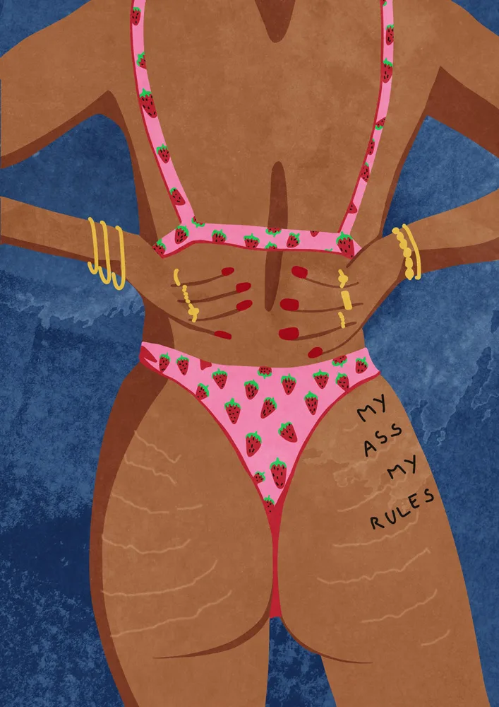 Farverig illustration af kvinde i badetøj med teksten “My Ass My Rules”. Et humoristisk og stærkt statement.