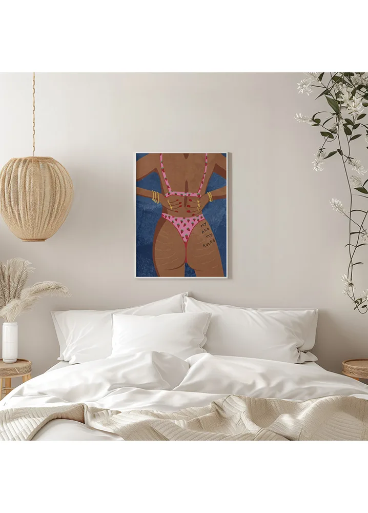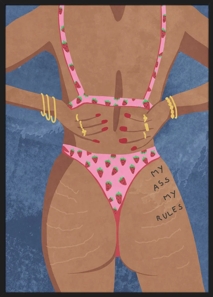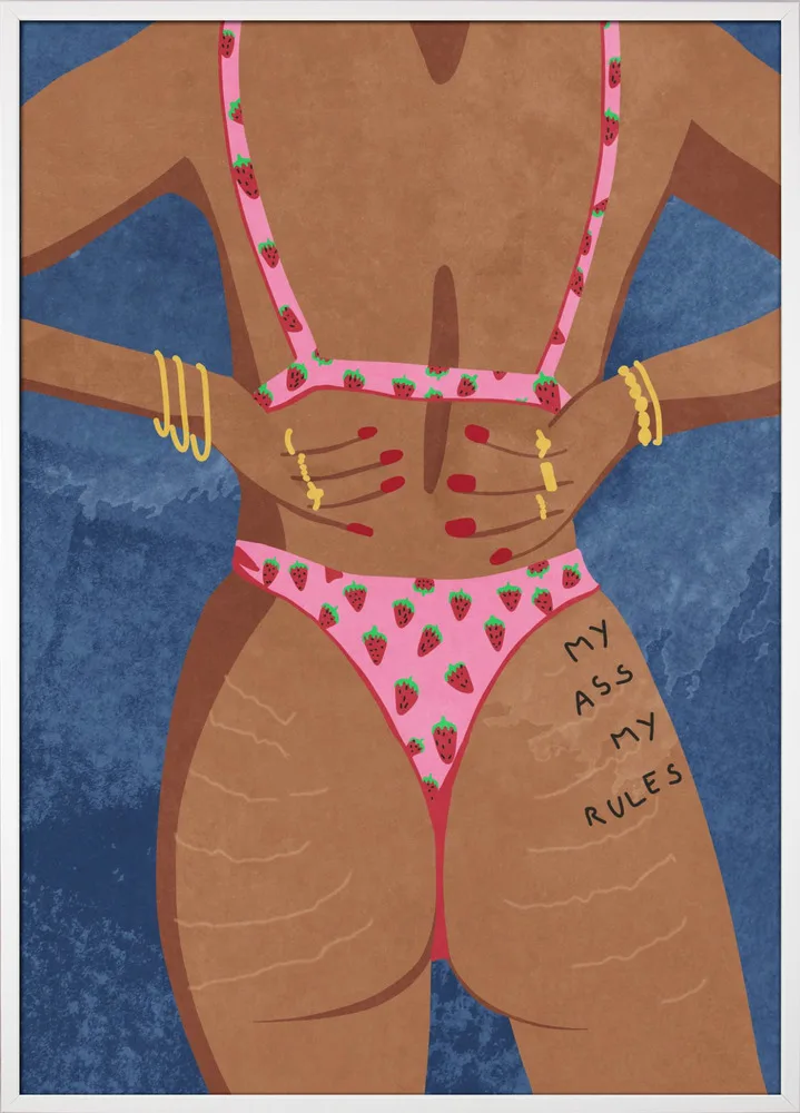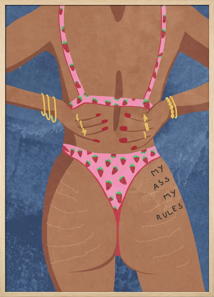 Raissa Oltmanns’ My Ass My Rules er en modig og humoristisk hyldest til kropspositivitet. Kvindens rosa badetøj, de gyldne armbånd og den blå baggrund giver motivet liv og styrke. En plakat, der udstråler selvtillid og attitude – perfekt til soveværelse, walk-in eller kreative rum.