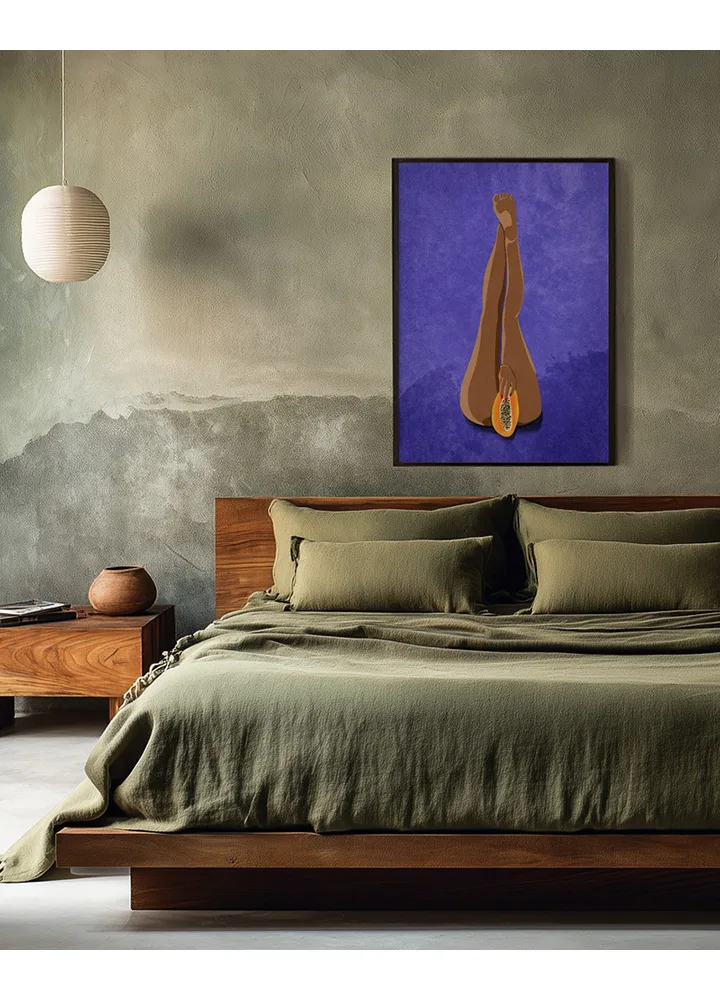 Raissa Oltmanns’ My Papaya kombinerer sensualitet og satire. Kvindens positur og den placerede frugt er både provokerende og poetisk. De varme brunlige nuancer mod den lilla baggrund skaber balance mellem styrke og leg. En plakat, der vækker samtale og fungerer som et ærligt, kunstnerisk statement.