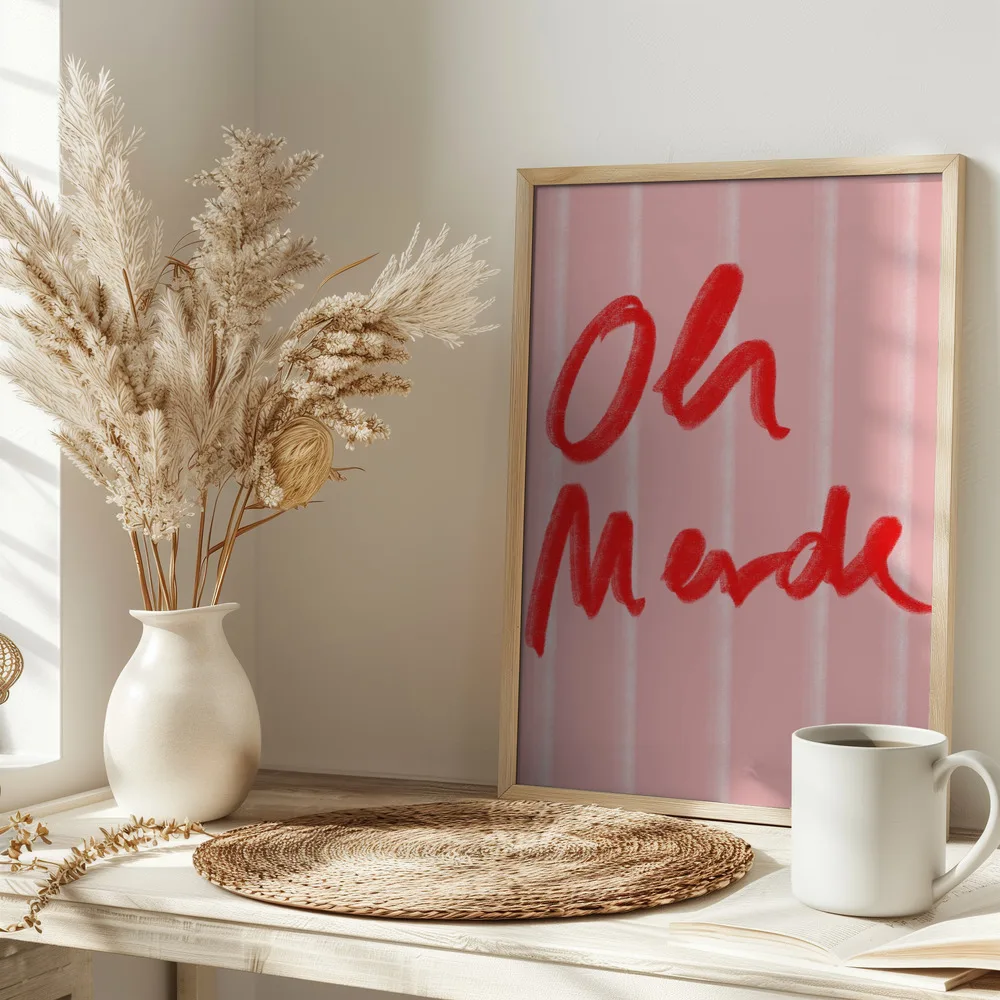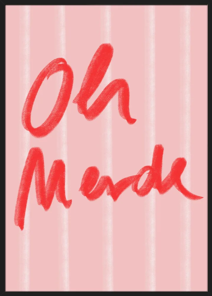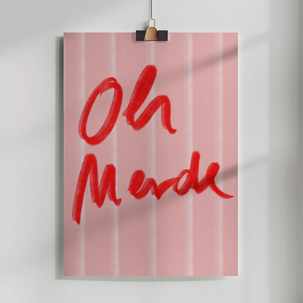 Sjov og stilfuld plakat med teksten Oh Merde i rød håndskrift på en lyserød, stribet baggrund. Et legende fransk udtryk.