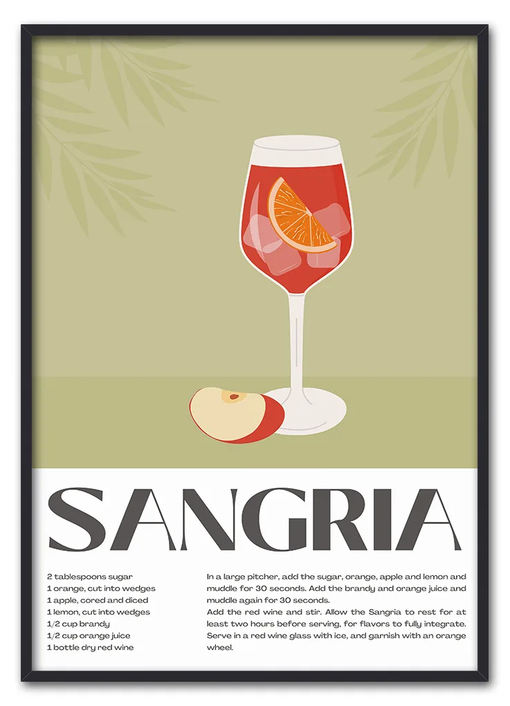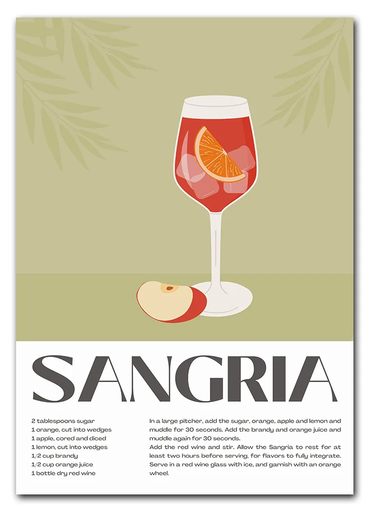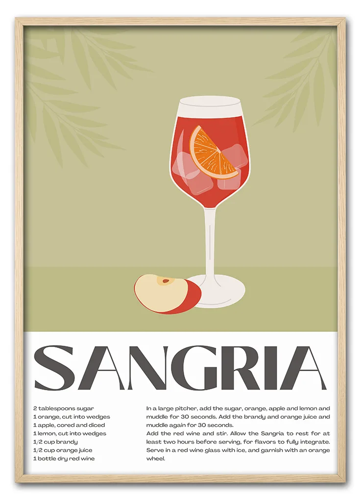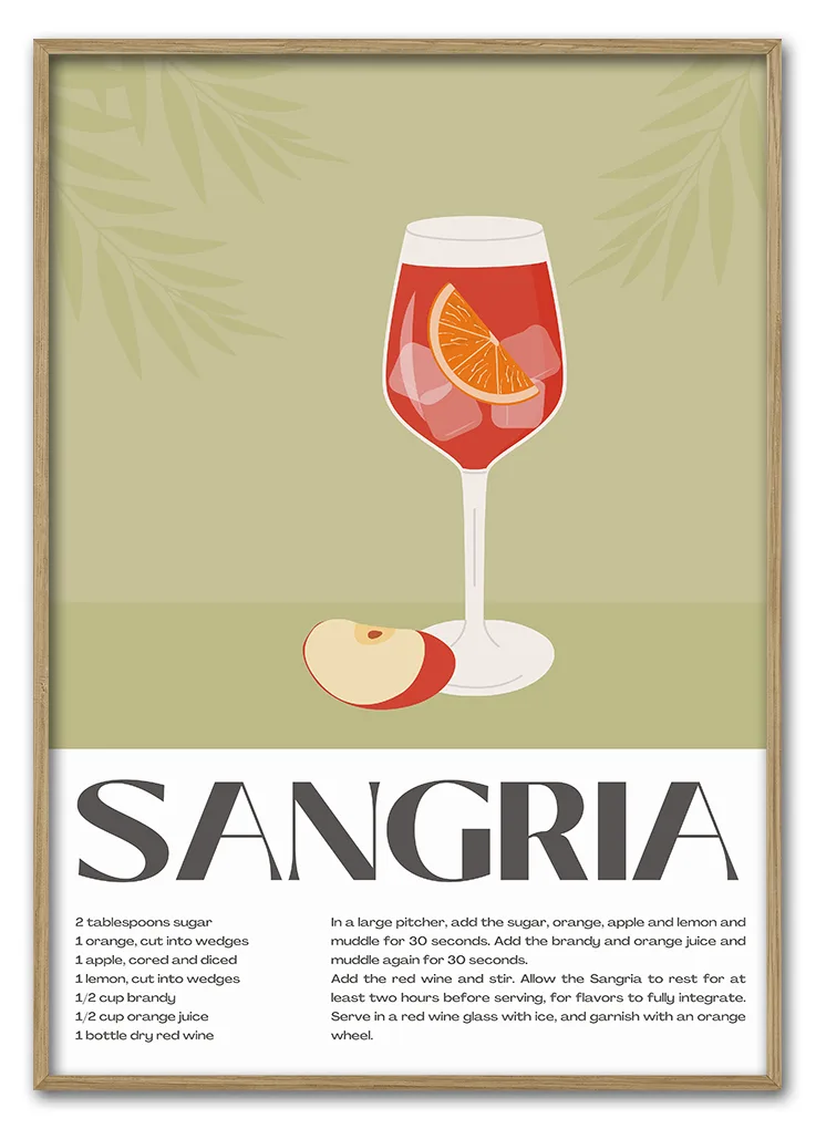 Grafisk plakat med Sangria og fersken. Sommerligt motiv med bløde, naturlige farver.