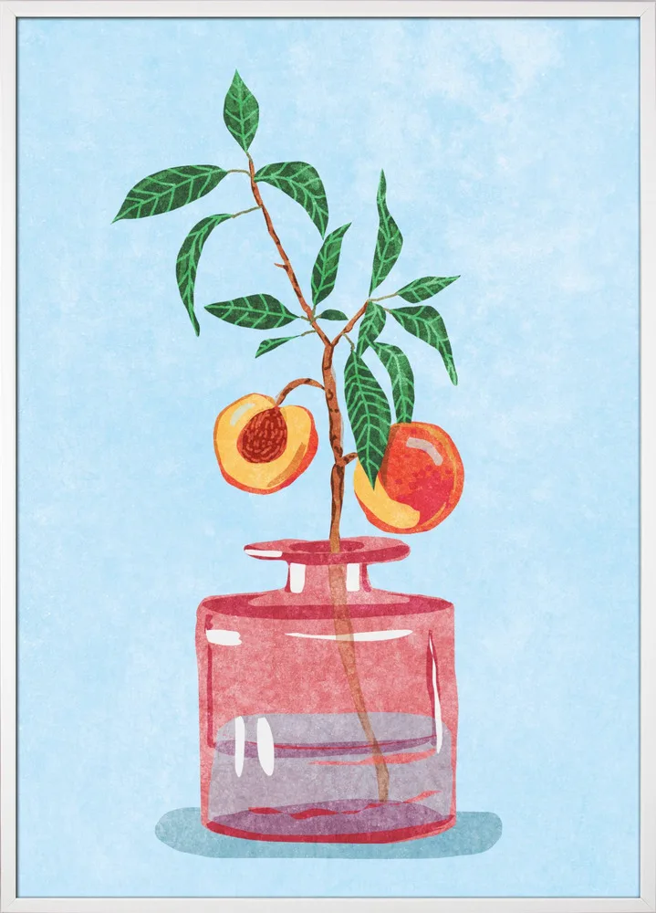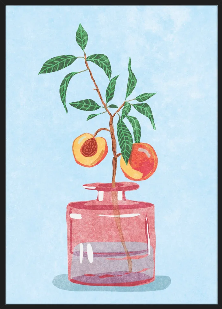 Smuk illustration af gren med ferskner i vase. Et roligt og farverigt køkkenmotiv.