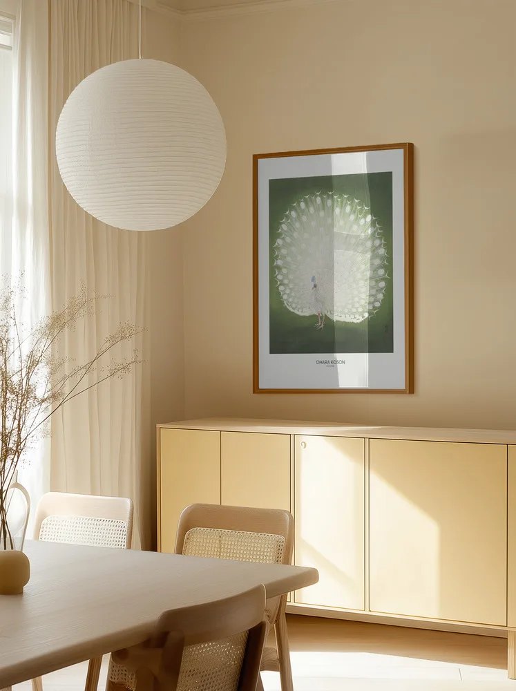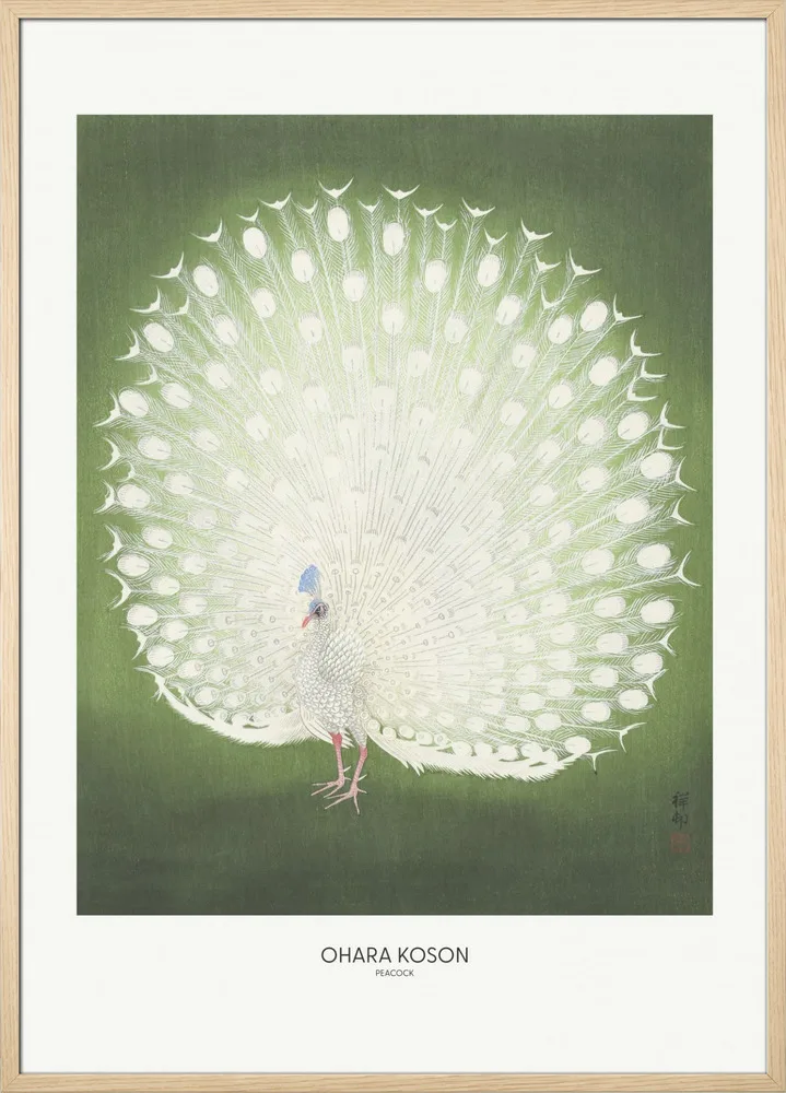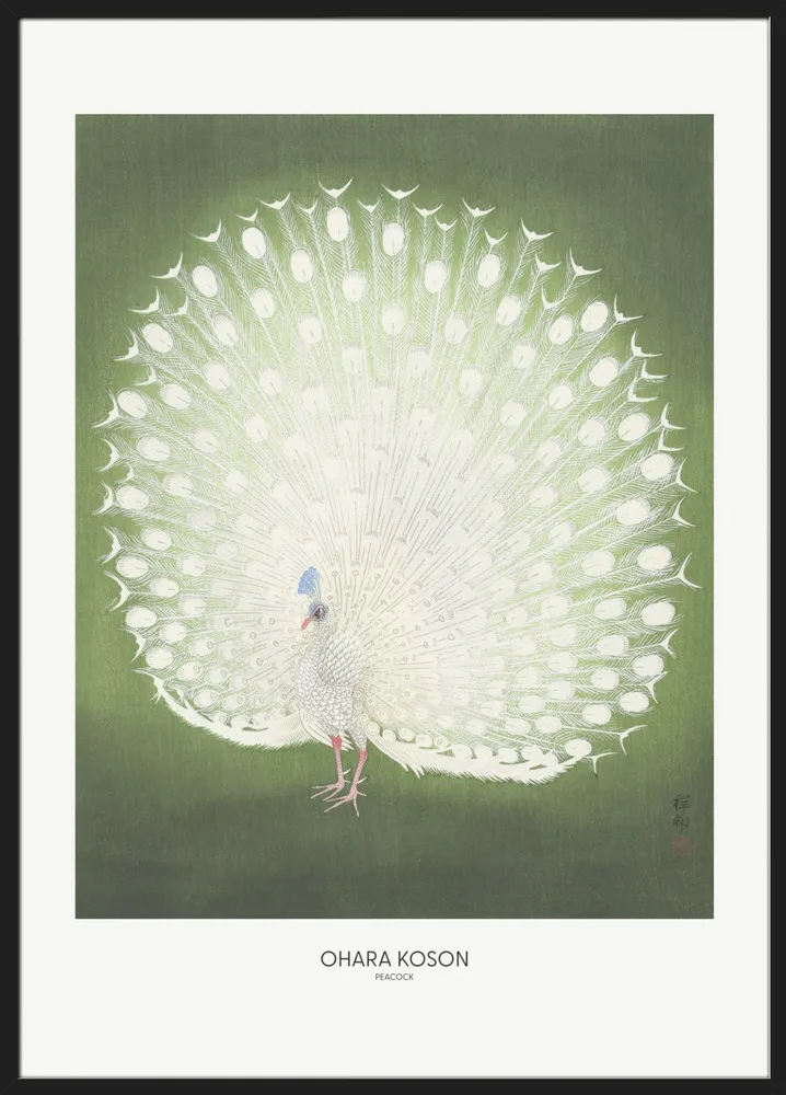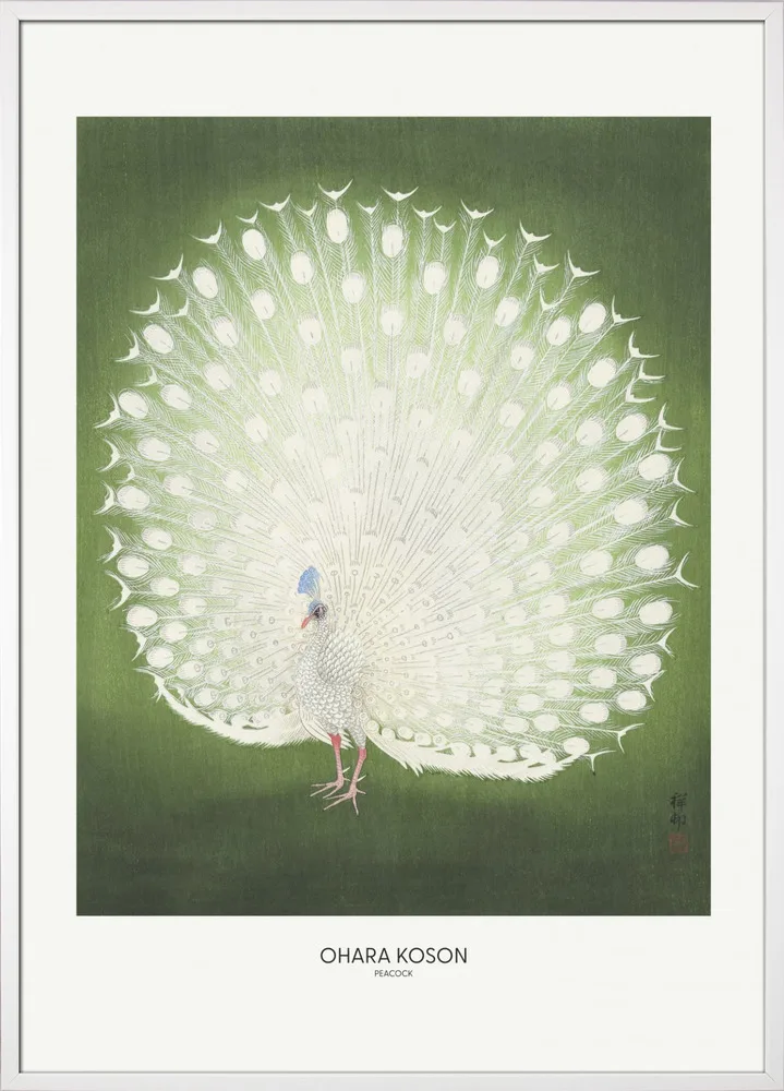 Japansk kunsttryk af Ohara Koson med en majestætisk hvid påfugl på grøn baggrund. Et symbol på skønhed og ynde.