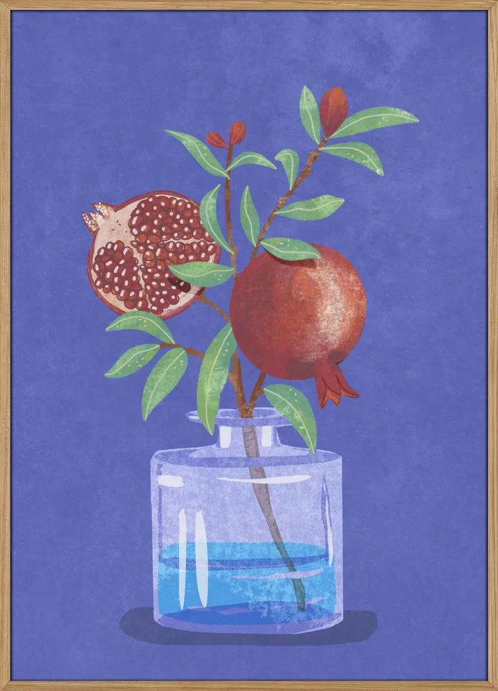Raissa Oltmanns’ Pomegranate in Vase kombinerer dybe røde og grønne nuancer i et motiv, der udstråler elegance og varme. Granatæblerne symboliserer rigdom og livskraft, og den blå baggrund giver værket et sofistikeret udtryk. En plakat, der passer perfekt til køkken eller stue.