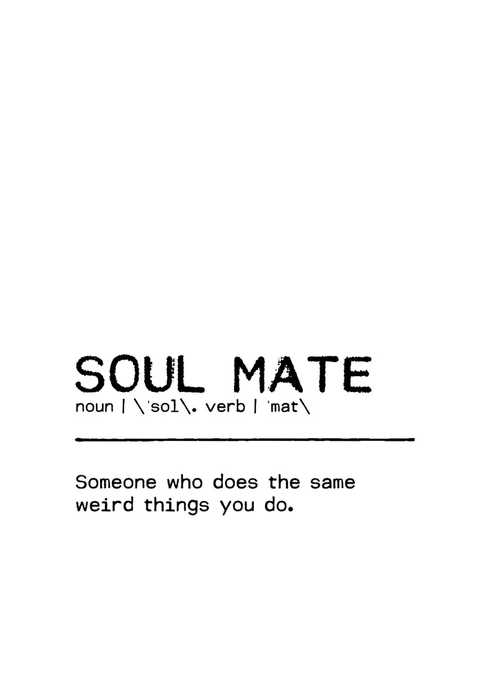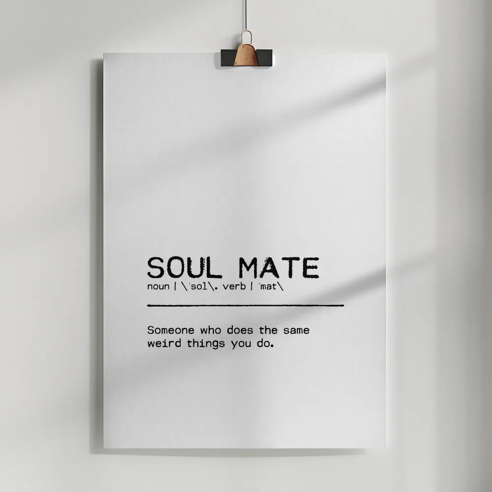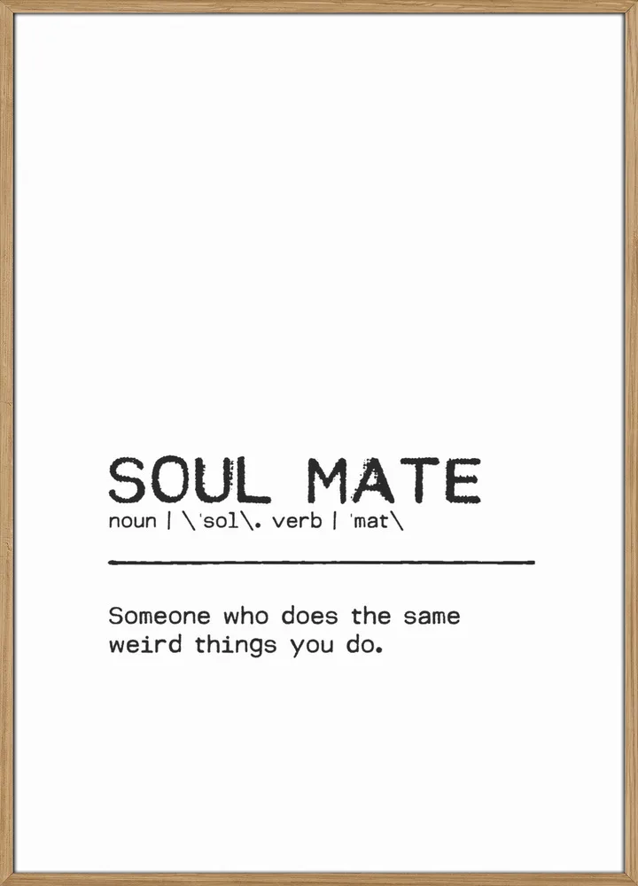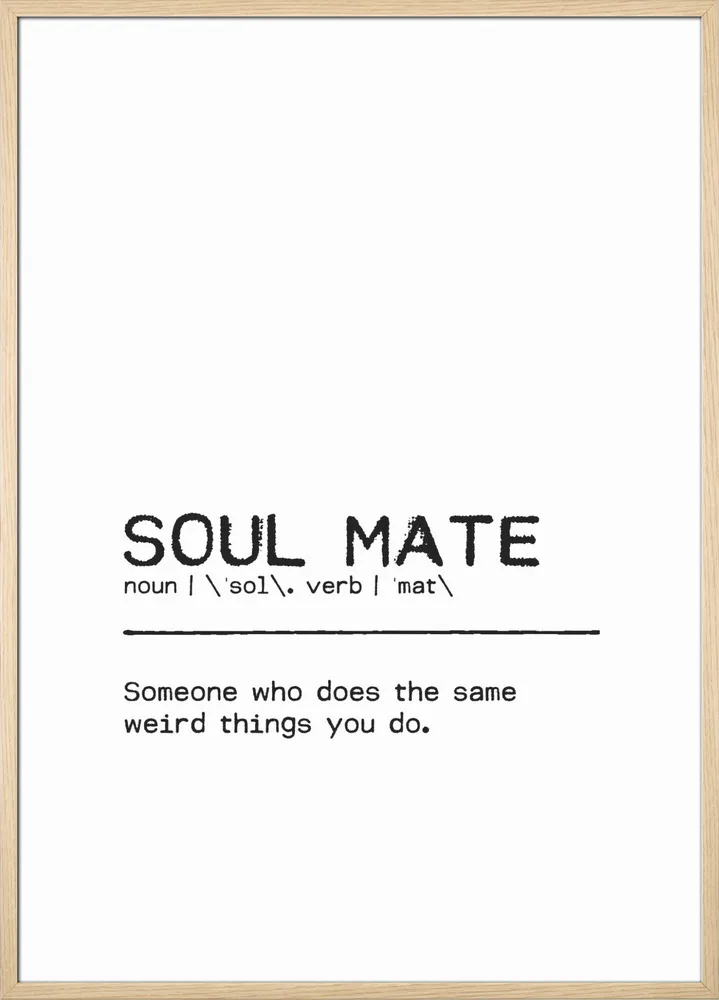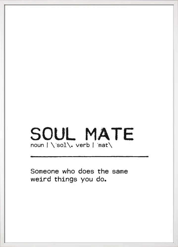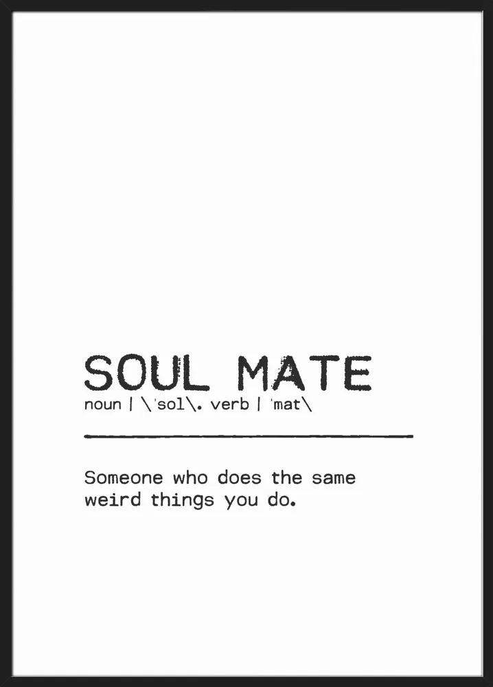 Sjov plakat i sort-hvid med definitionen af Soul Mate: Someone who does the same weird things you do. Enkel og charmerende.