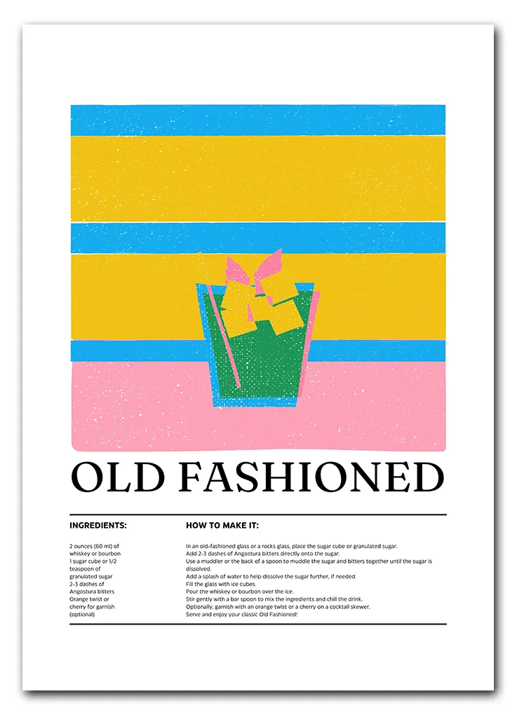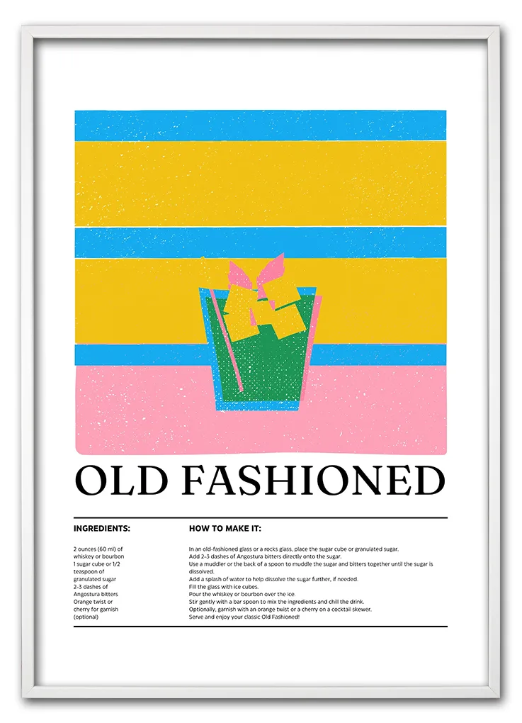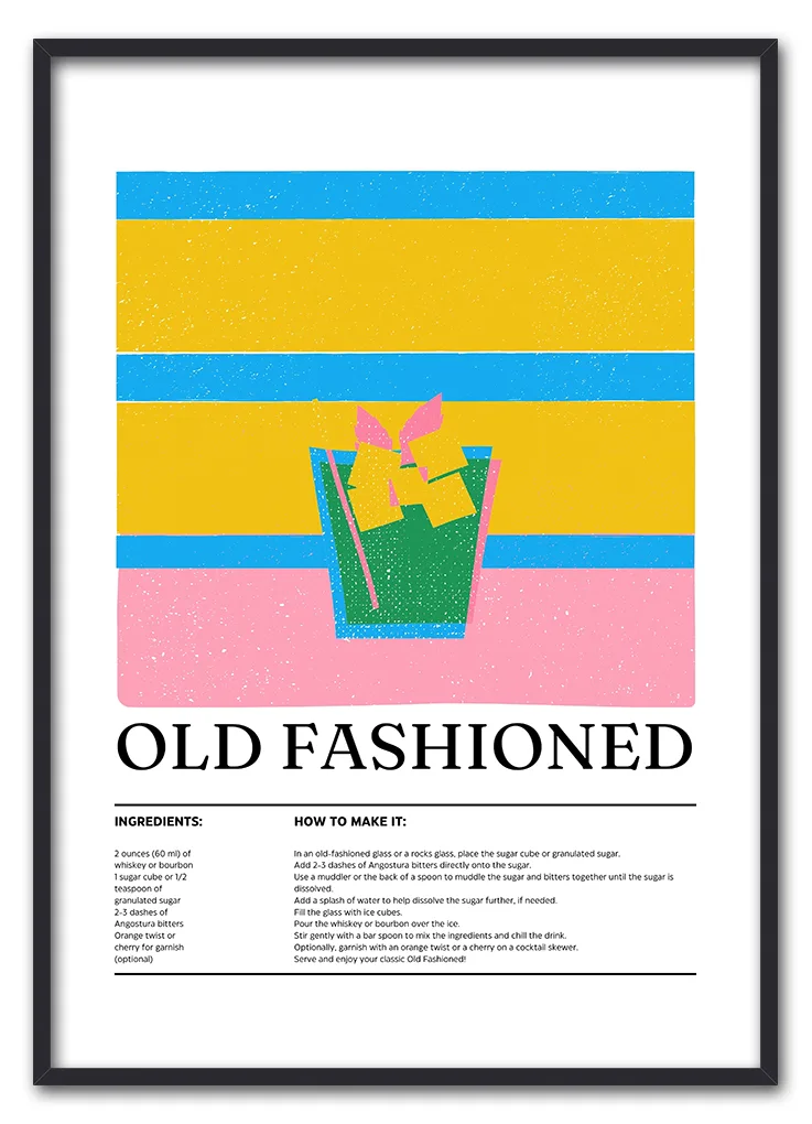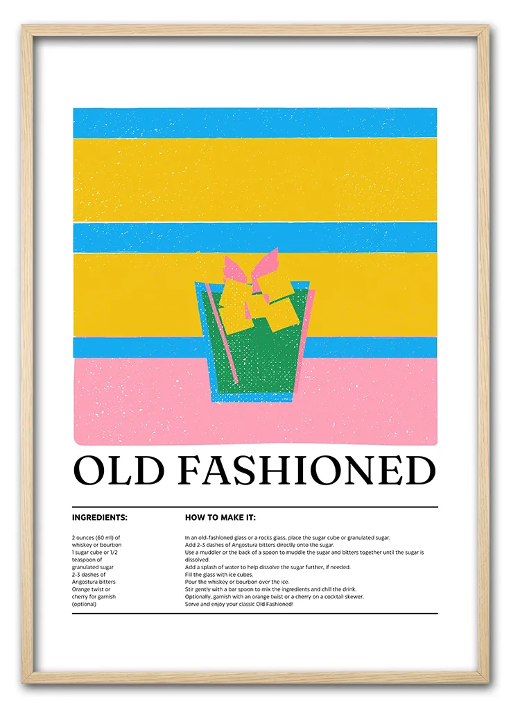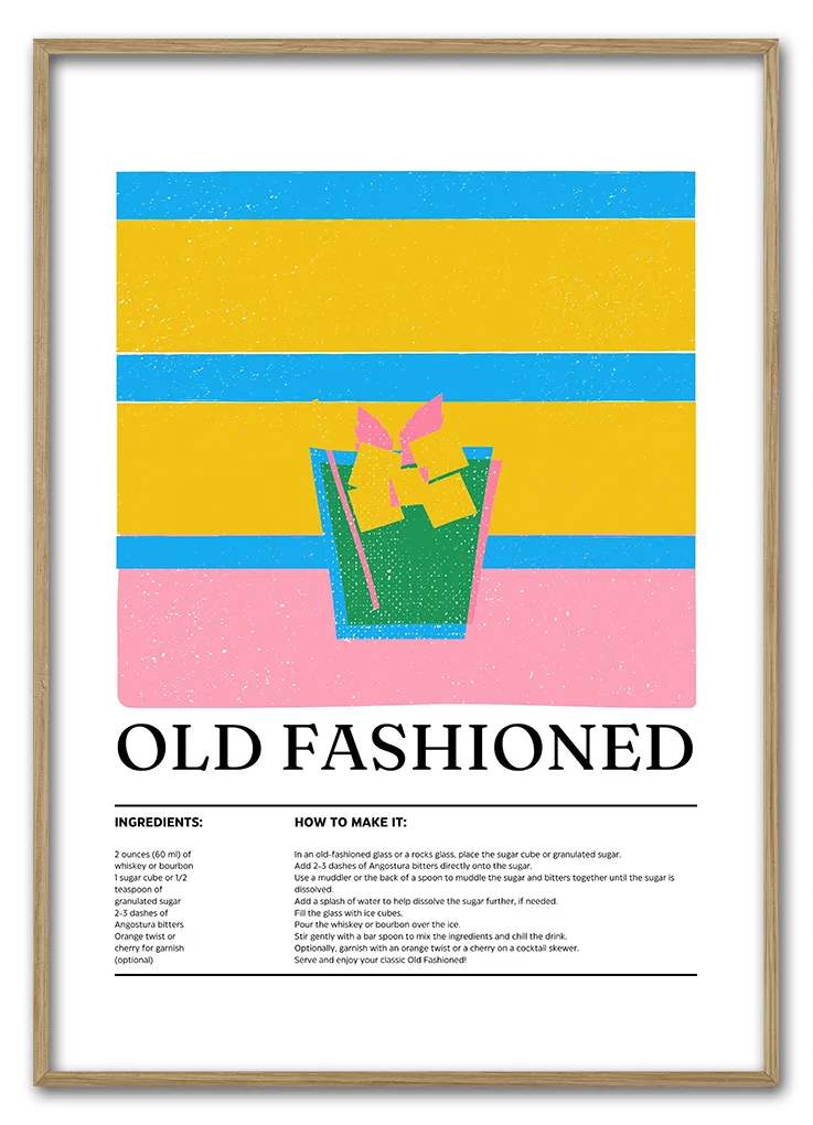 Cocktailplakat med Old Fashioned og retrostriber. Farverig og klassisk med opskrift.