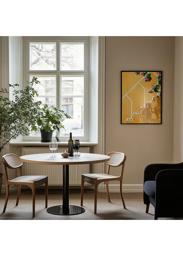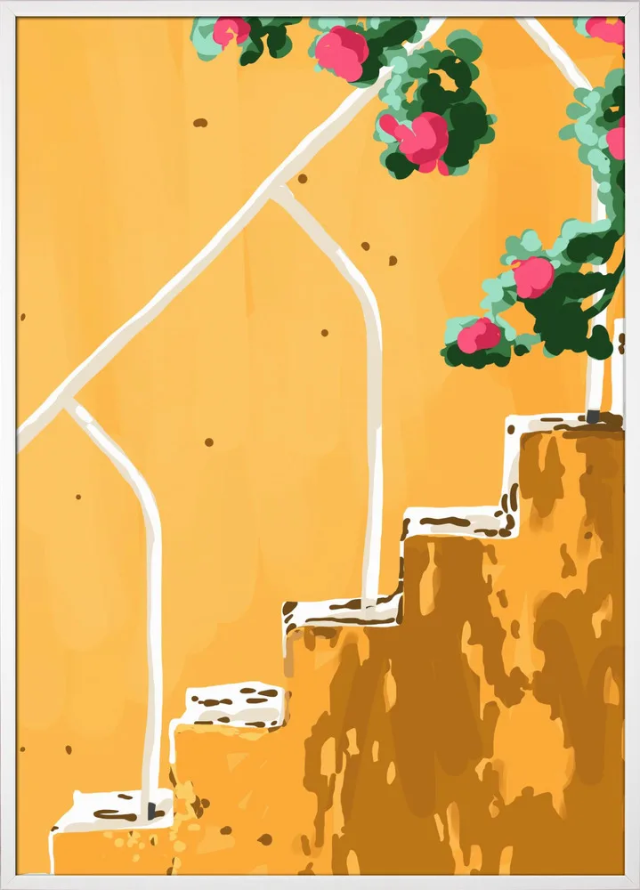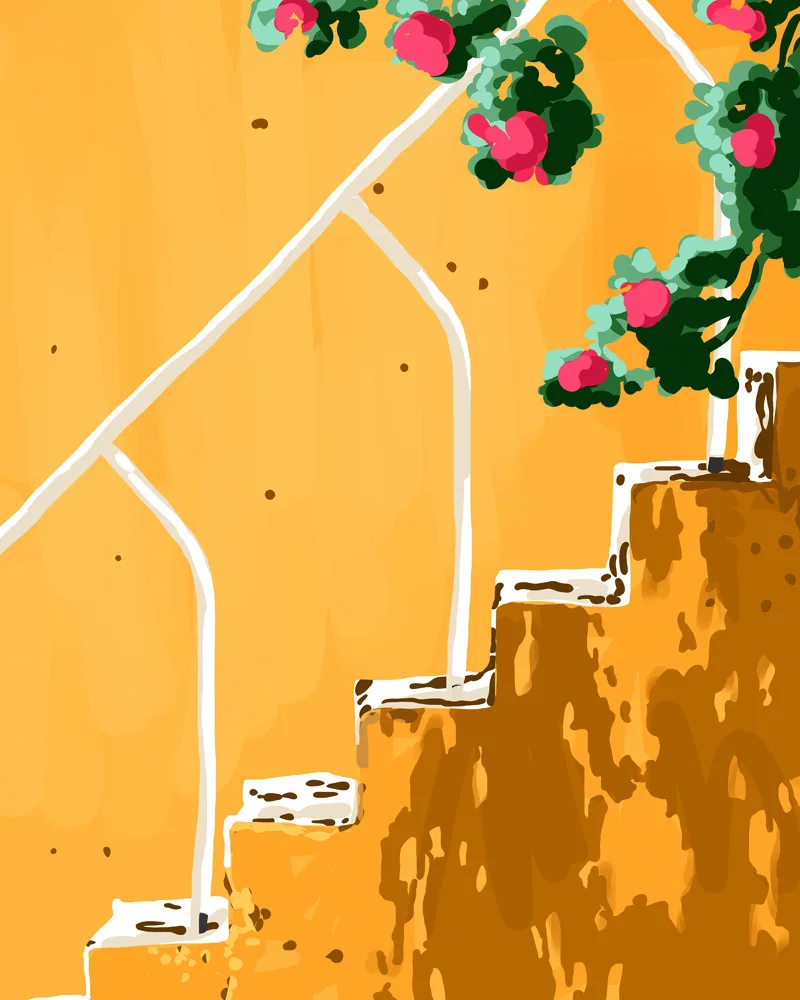 Stemningsfuld illustration af Uma Gokhale med solbeskinnet trappe og gyldne nuancer. Et fredfyldt og harmonisk motiv.