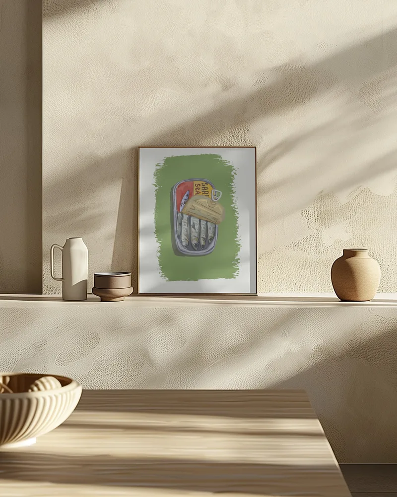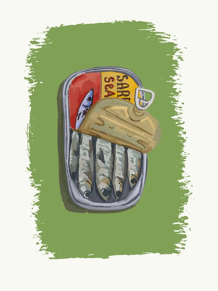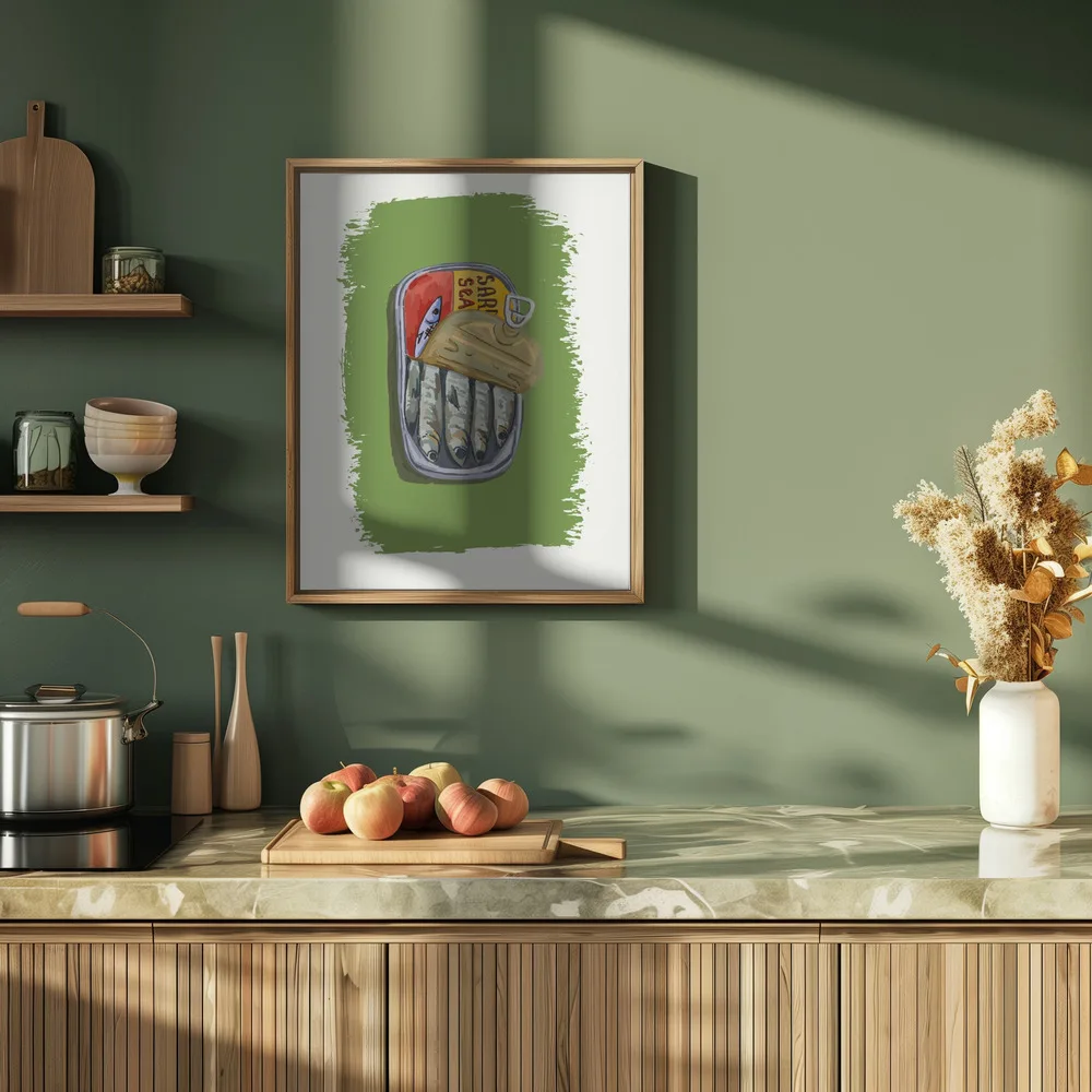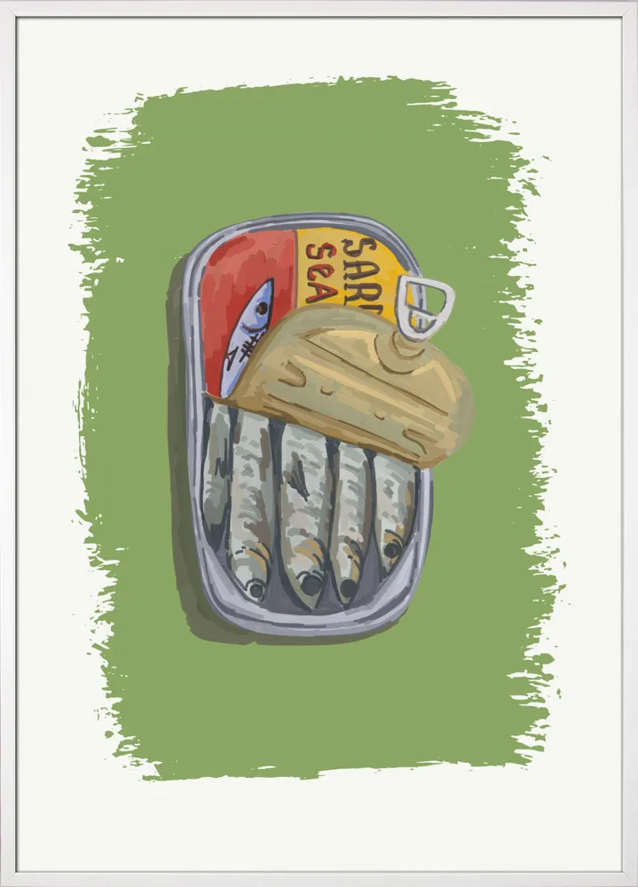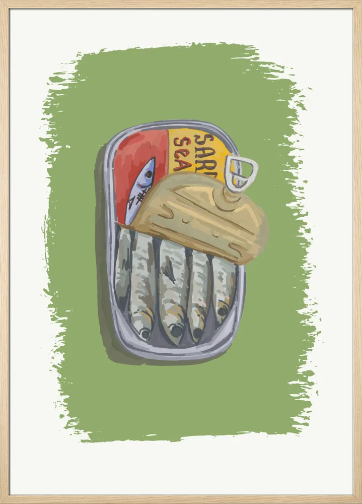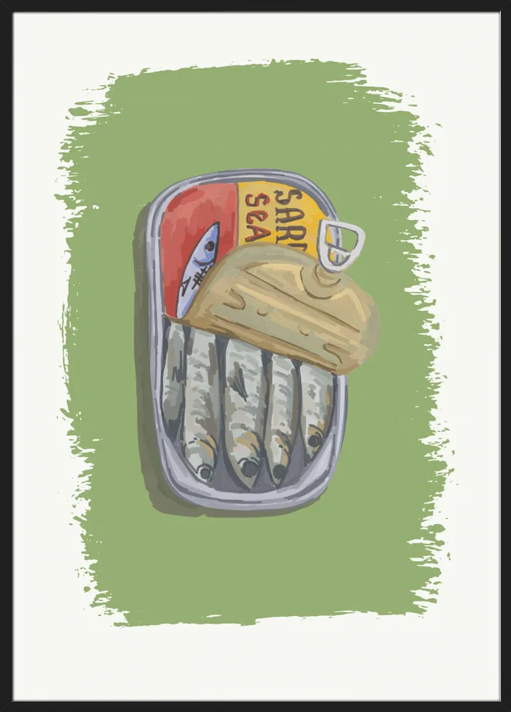 Vintage-inspireret sardinmotiv med grøn baggrund – en legende hyldest til klassisk emballagedesign.