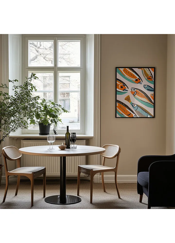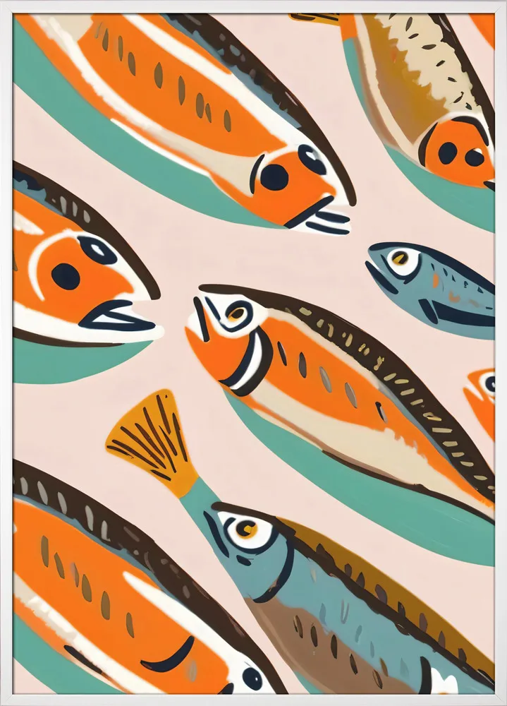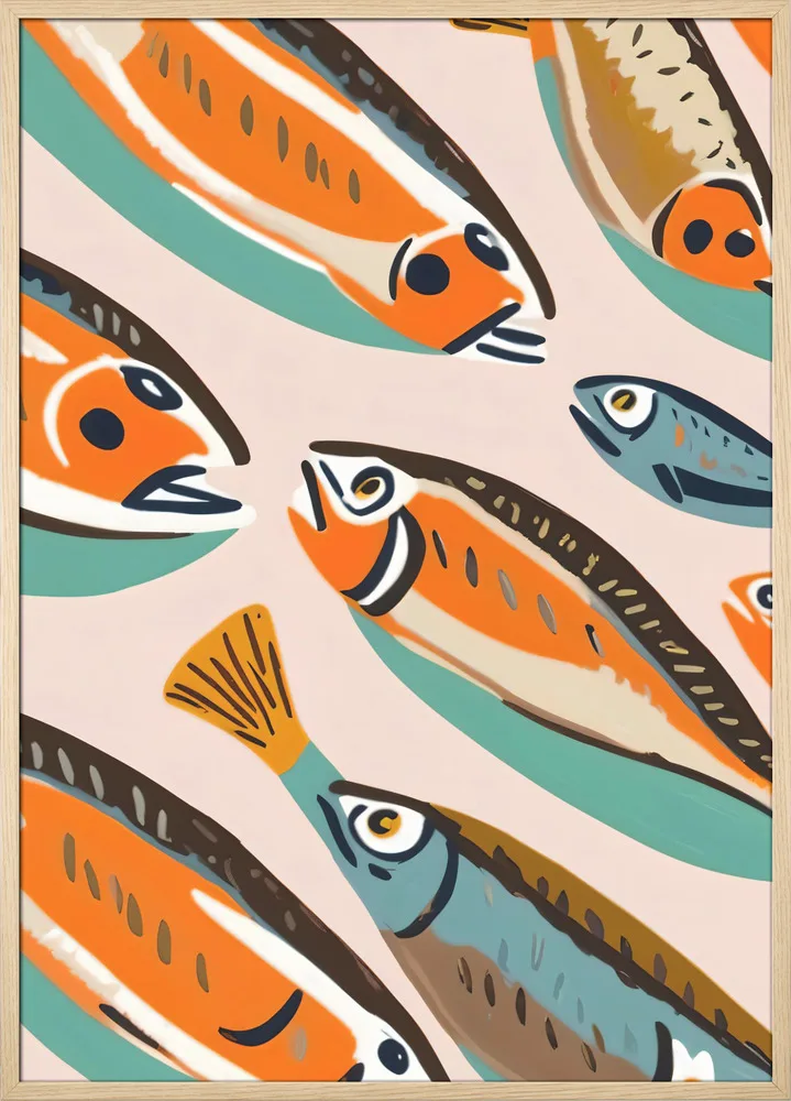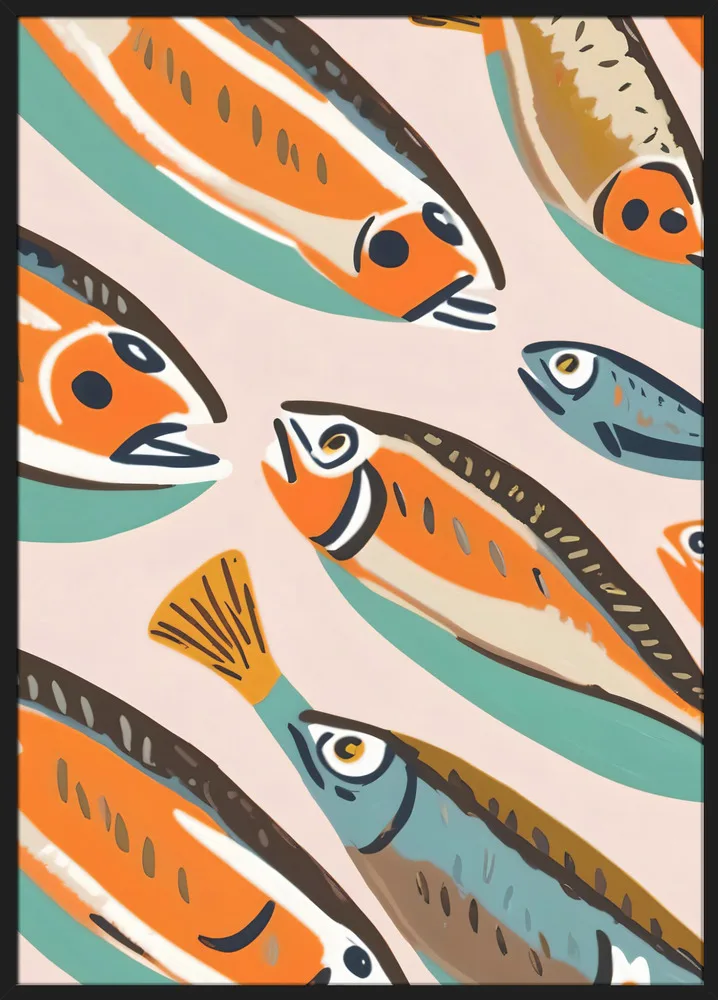 I Sardines II skaber Uma Goghale en legende og farverig fortolkning af havets liv. De orange, blå og sorte fisk ligger i lag mod en afdæmpet grøn baggrund, hvilket giver værket et grafisk og rytmisk udtryk. Farverne spiller elegant sammen og skaber bevægelse og energi. Motivet passer perfekt i køkkenet eller spisestuen og bringer et strejf af middelhav og humor ind i hjemmet.