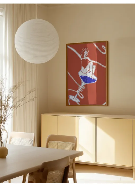Show girl af Mela Patterns er et livligt og poppet motiv, hvor en dansende kvinde poserer i et showkostume mod en kraftig rød baggrund. De hvide linjer og blå detaljer skaber bevægelse, mens Mela Patterns’ karakteristiske stil giver motivet humor og energi. Ideelt til kreative rum, barområder eller værelser, hvor der gerne må være glamour og attitude.