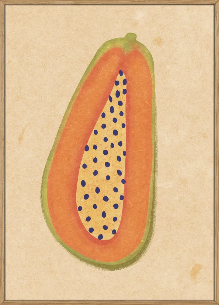 Raissa Oltmanns’ Simple Papaya er et rent og moderne værk, hvor farverne får lov at tale. Den orange frugt med sorte prikker står klart mod den beige baggrund og giver motivet en rolig, men frisk energi. En plakat, der passer smukt i køkkenet eller i en farverig billedvæg.