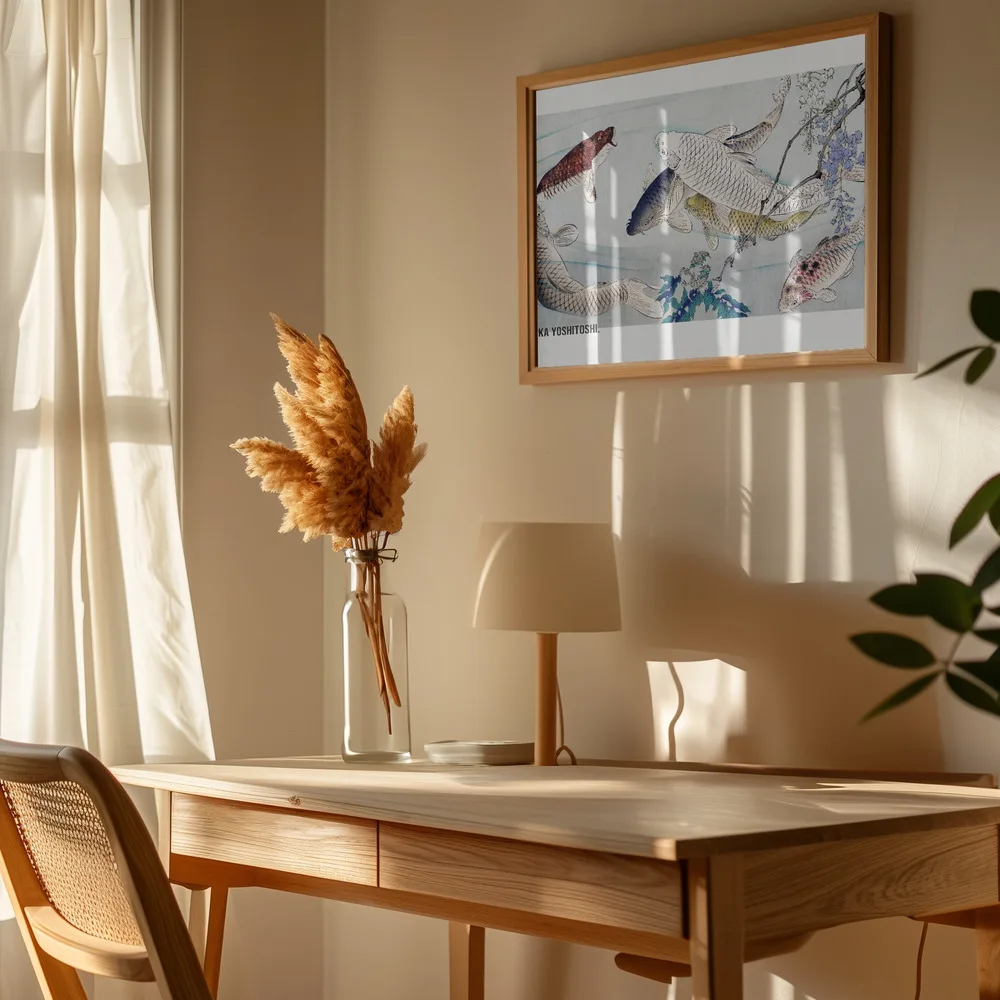 Six Carp Swimming Beneath Wisteria (1889) 1 af Tsukioka Yoshitoshi viser karper i bevægelse under et dække af lilla wisteria-blomster. De levende farver og præcise linjer vidner om Yoshitoshis tekniske kunnen og sans for detaljer. Motivet symboliserer udholdenhed og harmoni og bringer naturens rytme ind i hjemmet. Perfekt til stuer, kontorer eller rum, hvor man ønsker et klassisk japansk udtryk med historie og balance.