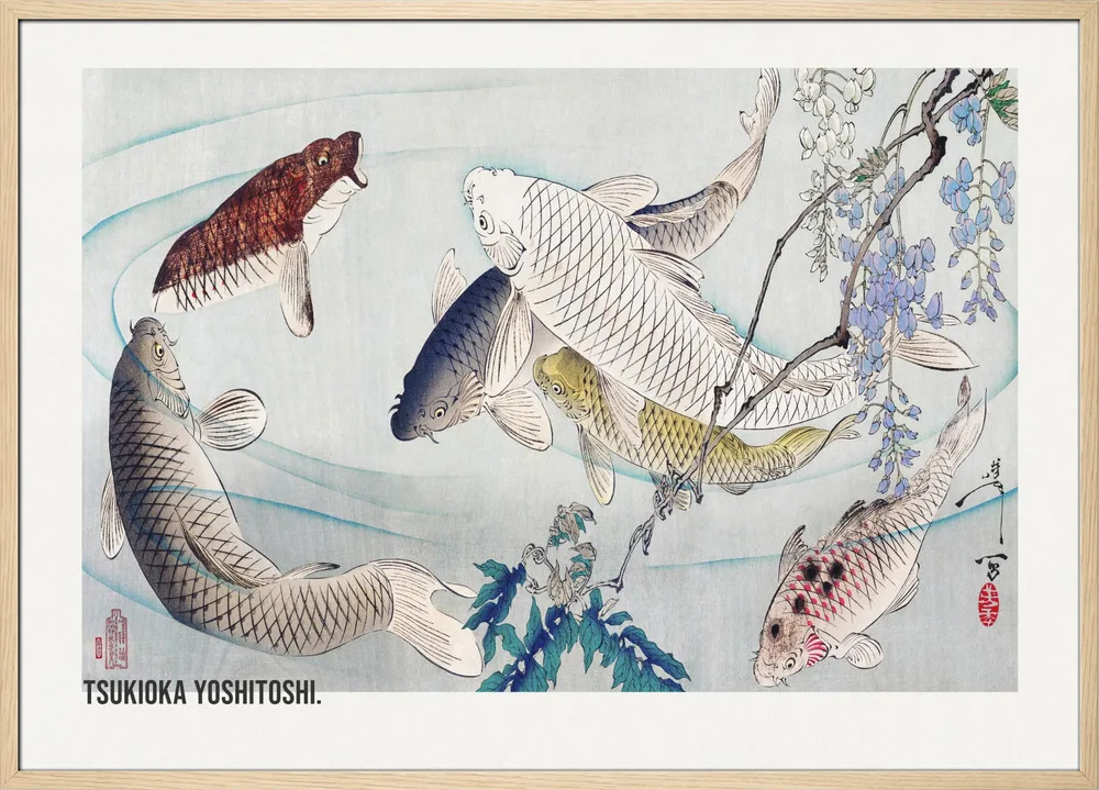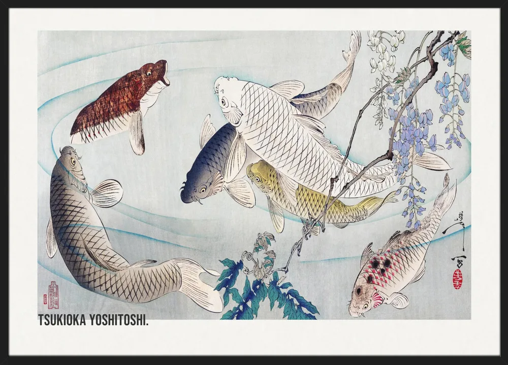 Historisk japansk træsnit af Tsukioka Yoshitoshi med seks karper under hængende blomster. Et klassisk motiv fyldt med liv.