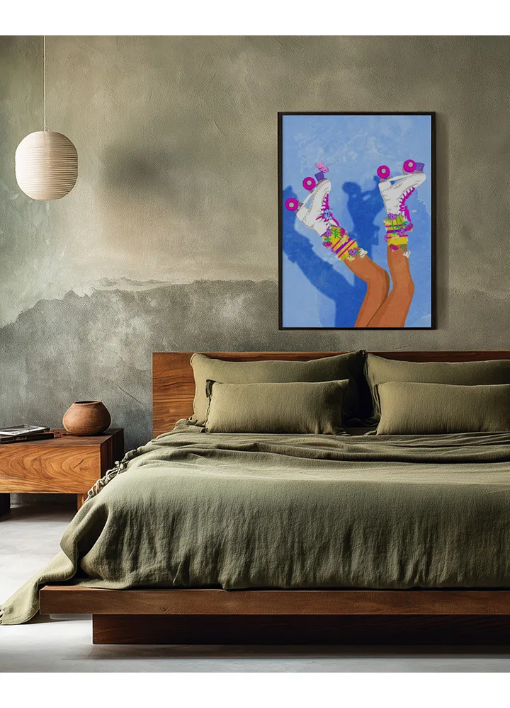 Raissa Oltmanns’ Skate like a Girl er fuld af bevægelse, humor og 80’er-stemning. De hvide skøjter, lilla strømper og blå baggrund giver et ungdommeligt, energisk udtryk. Et perfekt valg til stuen, ungdomsværelset eller et farverigt hjem, hvor personlighed må fylde.
