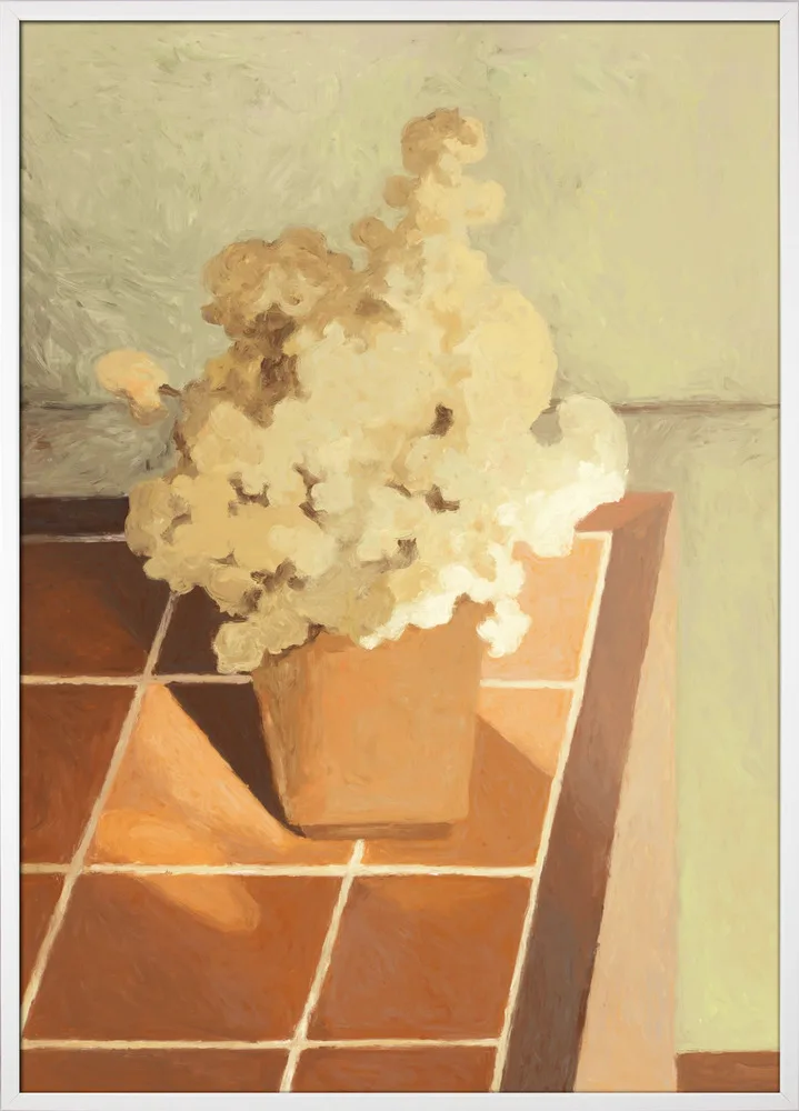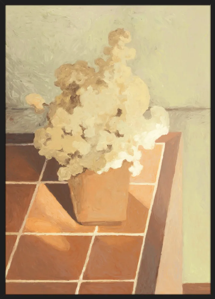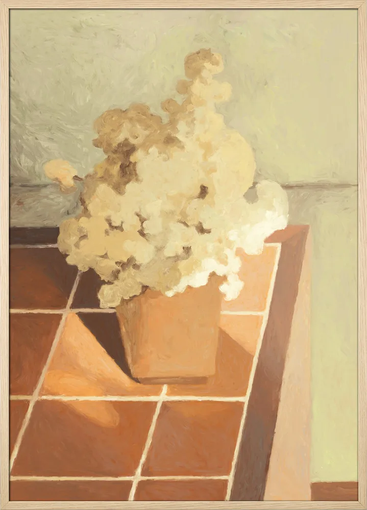 Still Life 01 af NKTN er et elegant stilleben, hvor en vase med bløde blomster står på et varmt terrazzobord. Farvepaletten består af beige, brune og okkerfarvede toner, der giver en naturlig og rolig atmosfære. NKTN’s malede tekstur og enkle komposition gør motivet ideelt til stue, køkken eller spiseområde. Et tidløst og varmt kunstværk.