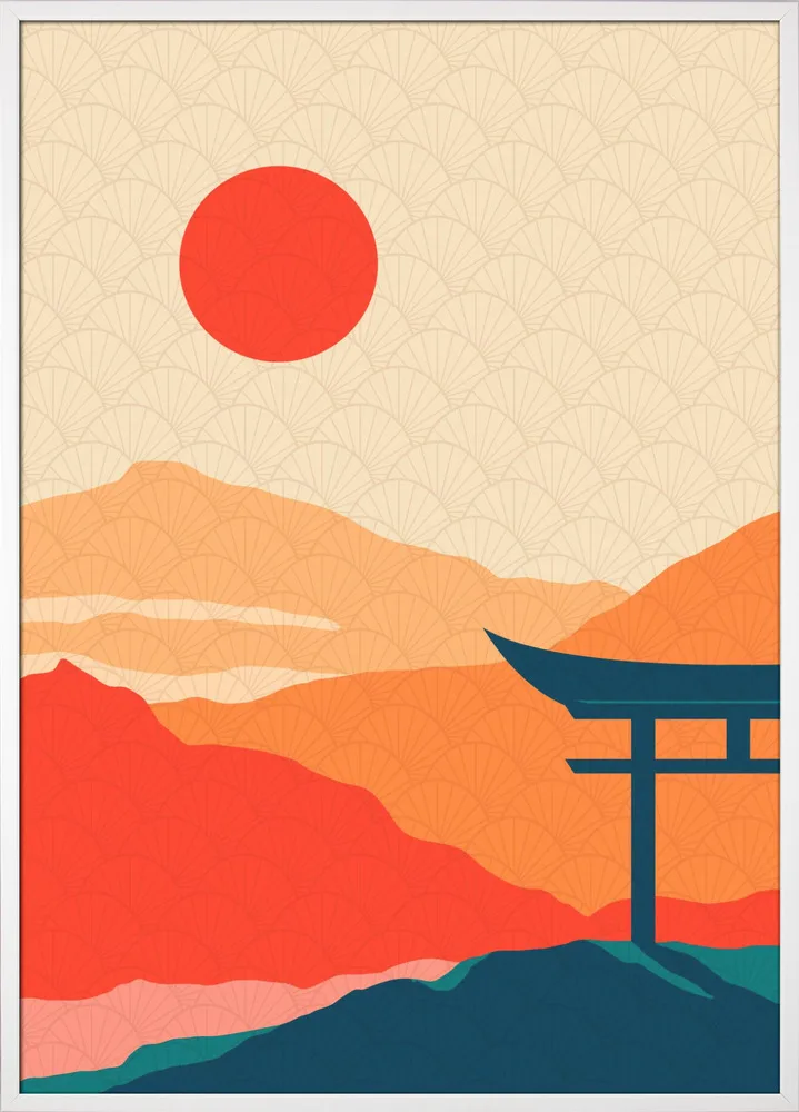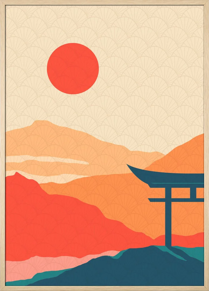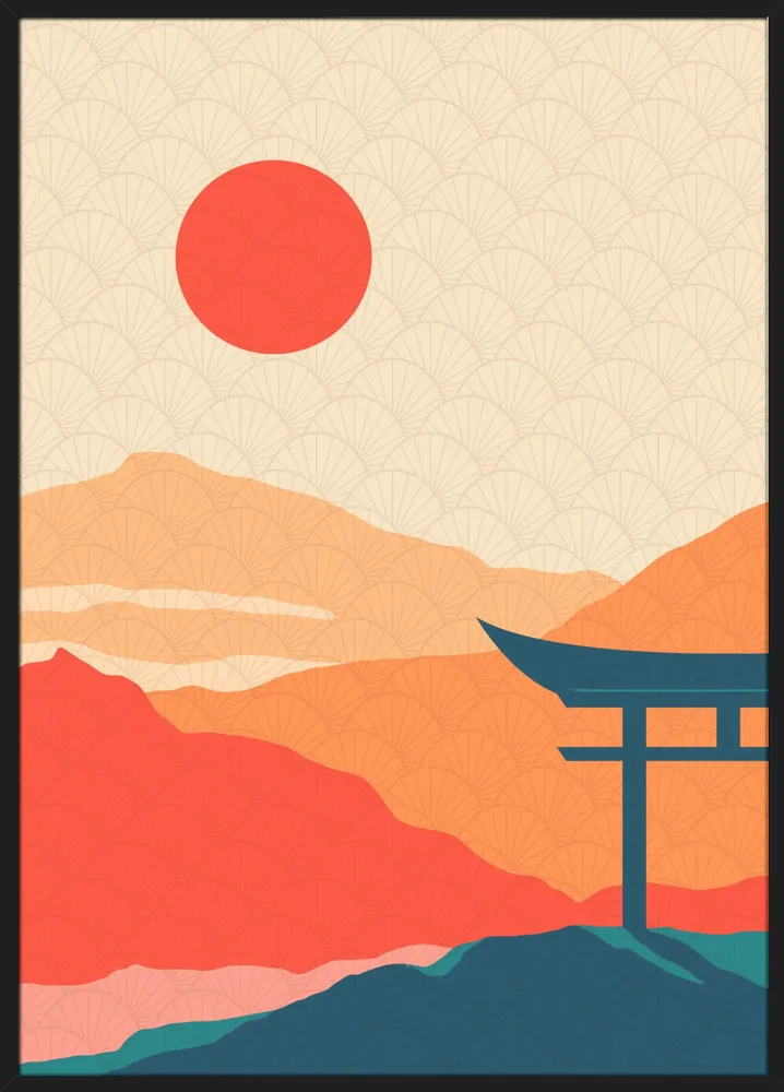 Farverig japansk illustration af Fadil Roze med rød sol og bjerglandskab. Et grafisk og harmonisk motiv.