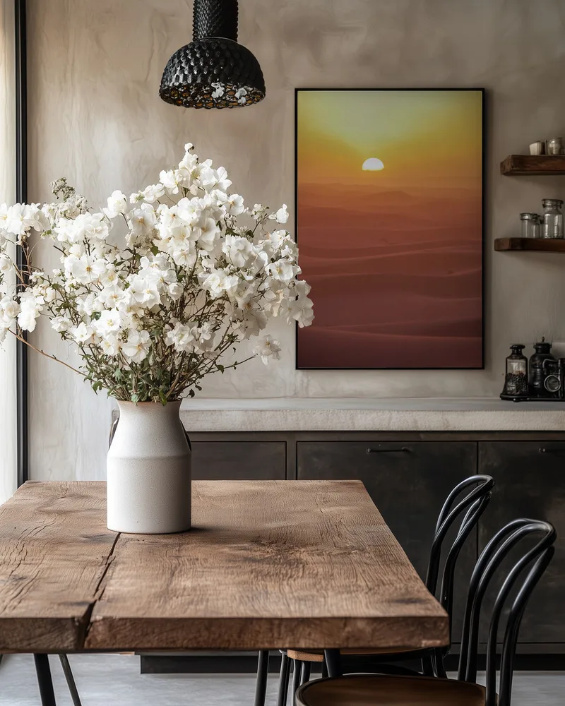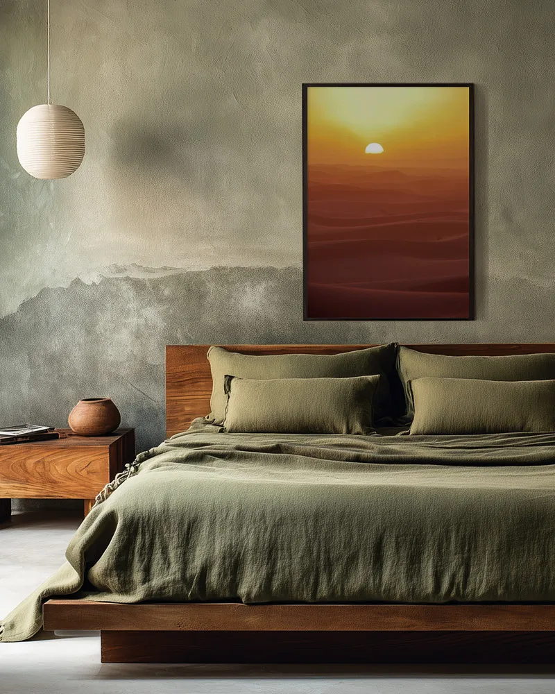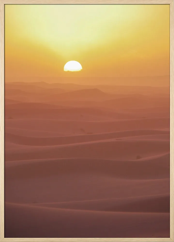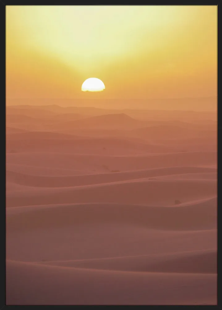 Stemningsfuld plakat med solnedgang over ørkensand. Et varmt og dragende naturmotiv.