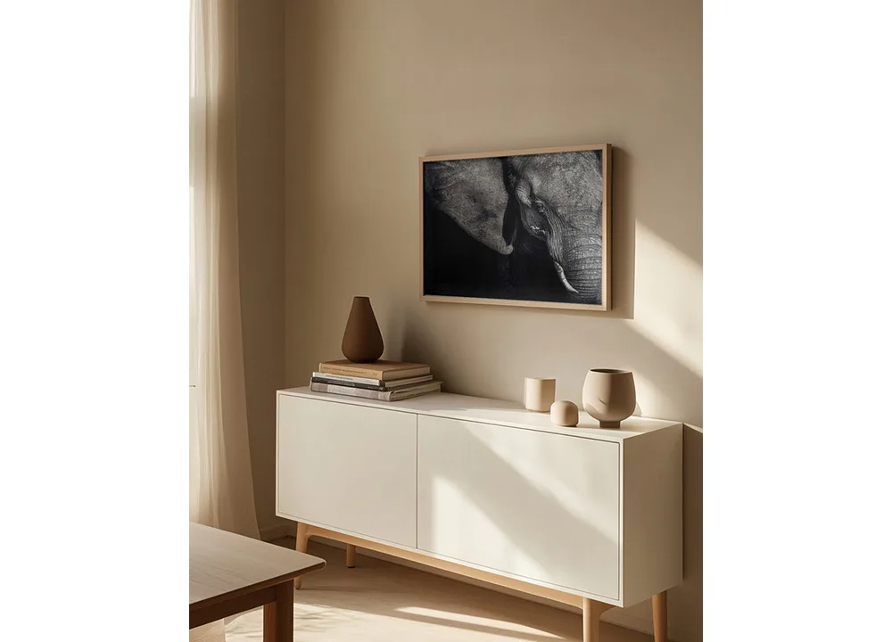 Sort/hvid plakat af elefantmor og unge. Et majestætisk og rørende motiv med naturlig styrke.