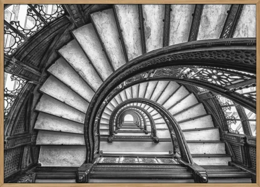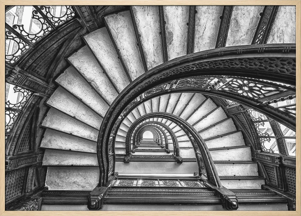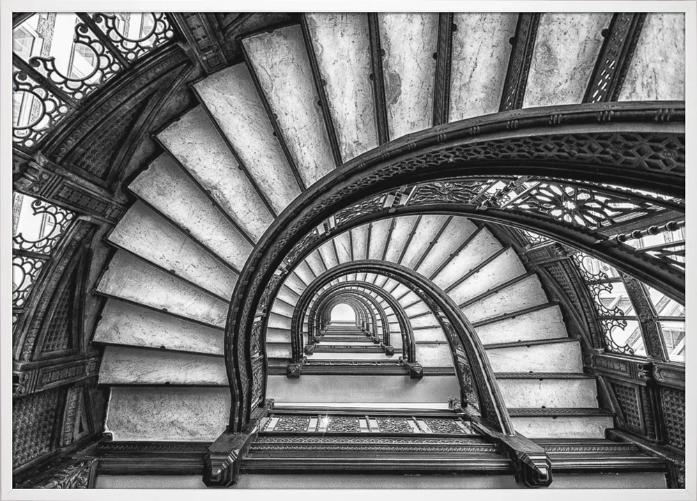 ‘The Rookery’ af Yimei Sun er en grafisk og fascinerende fotokunstplakat, hvor den spiralformede trappe danner et hypnotiserende mønster. Den præcise komposition og de skarpe kontraster giver en følelse af bevægelse og uendelighed. Sun forener arkitektur og kunst i et elegant motiv, der passer perfekt i moderne hjem, kontorer eller rum med minimalistisk æstetik.
