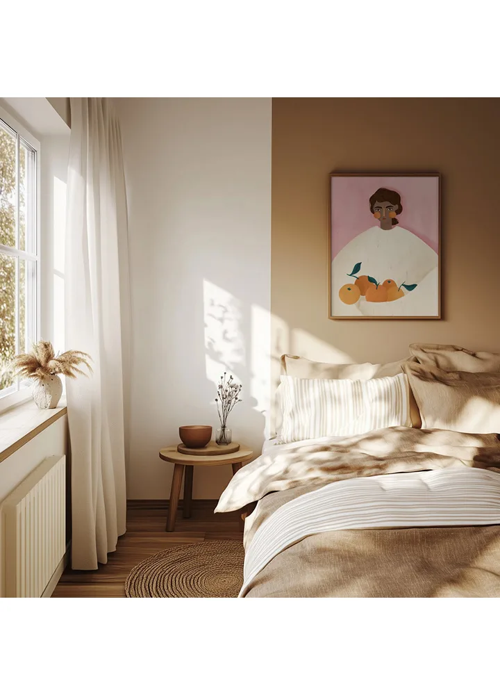 Et charmerende motiv med en kvinde i blød hvid trøje, der holder en bunke appelsiner foran sig. De varme farver og enkle former skaber et blødt, naturligt og hyggeligt udtryk. Perfekt i køkkenet, spisestuen eller stuen, hvor farver og varme detaljer skaber hjemlig stemning.