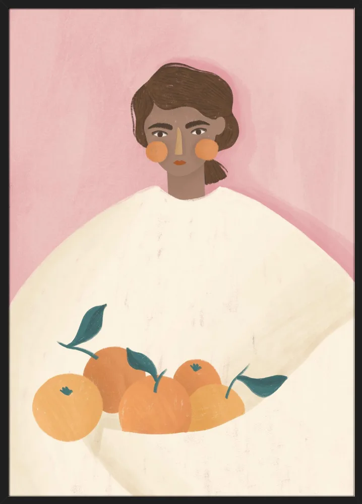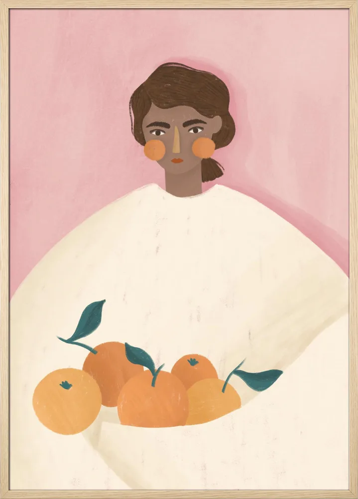 The Woman With the Oranges af Bea Müller er et varmt og hverdagsnært portræt, der kombinerer enkelhed med grafisk finesse. Kvinden står i en blød, hvid og voluminøs trøje, som danner en rolig kontrast til de klare orange nuancer i appelsinerne. Motivet har en let nostalgisk og organisk stemning, der skaber en følelse af nærvær, enkelthed og ro. Bea Müllers stil ses tydeligt i de afrundede former, de bløde overgange og den harmoniske farvepalette, som spænder fra creme og rosa til orange og grøn. Denne plakat fungerer perfekt i køkkenet eller spisestuen, hvor madmotiver naturligt integreres, men den egner sig også flot i stuer eller sommerhuse, hvor man ønsker et varmt og positivt udtryk. Sammen med andre frugt- eller blomsterillustrationer fra Bea Müller skaber den en smuk, farverig helhed. Et opløftende og charmerende motiv med naturlig varme.