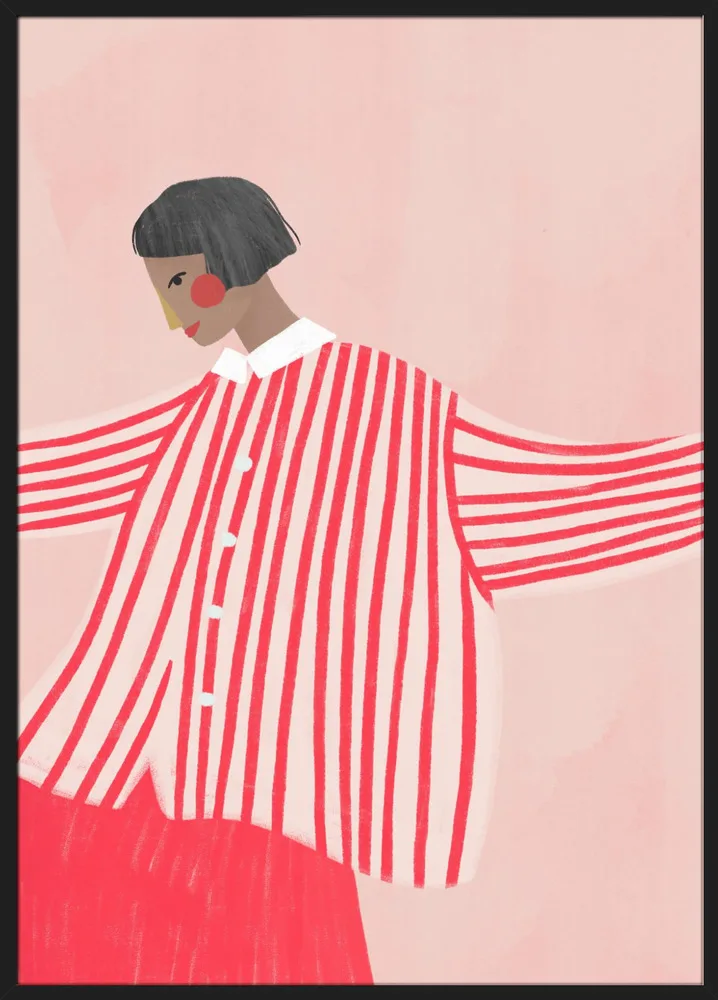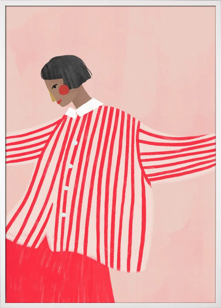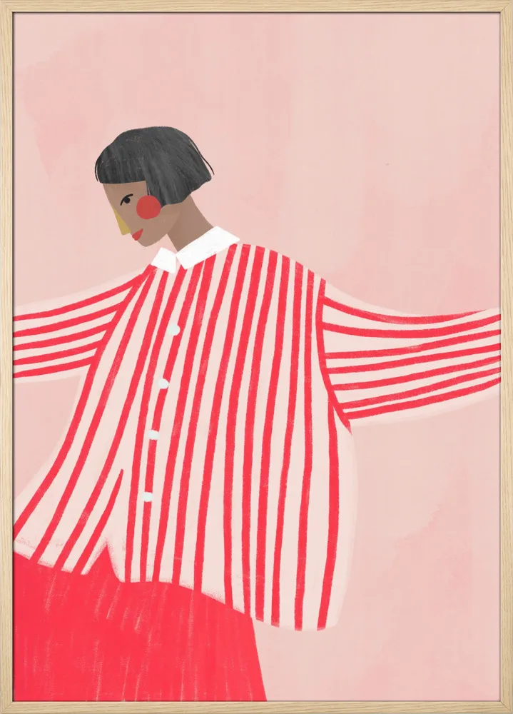 The Woman With the Red Stripes af Bea Müller er et kraftfuldt motiv, der kombinerer modige farver og skarpt grafisk design. Den røde baggrund skaber en dramatisk ramme om kvinden, hvis bluse består af brede, håndtegnede røde og hvide striber. Farverne er varme, intense og fulde af personlighed. Kvindens bløde positur og det lille hvide tørklæde i håret giver motivet en poetisk kontrast til den markante farvepalet. Bea Müllers kunstneriske signatur ses i de afrundede former, den harmoniske komposition og de stærke farver, som tilsammen skaber et motiv, der både er moderne, feminint og grafisk. Denne plakat fungerer fremragende i farverige hjem, men kan også være et statement i et neutralt rum, hvor den giver liv og kant. Den egner sig især til stuer, kreative rum og entréer, hvor man ønsker en visuel wow-effekt.
